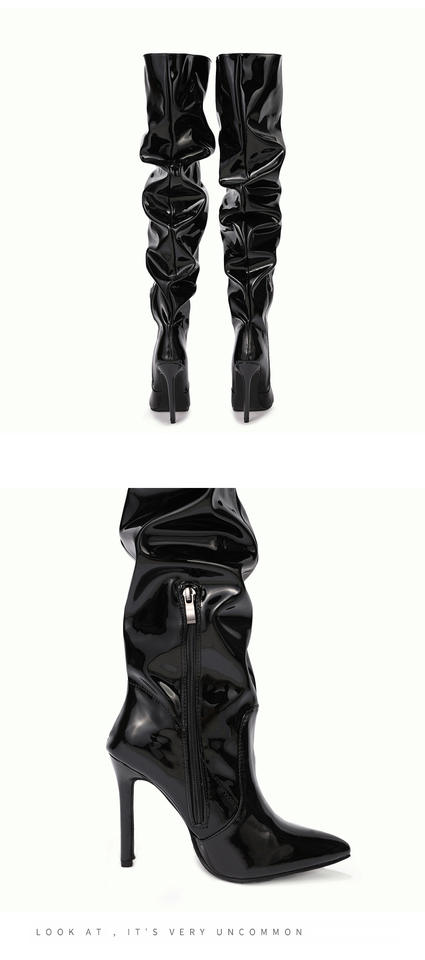 Nuevo estilo: botas elásticas por encima de la rodilla, puntera puntiaguda, charol, caña alta negra con cremallera, botas para mujer