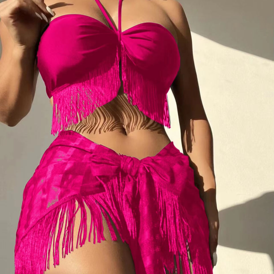 Nuevo Bikini de Tres Piezas con Tirantes, Color Sólido, con Flecos Sexys en el Pecho y Malla Transparente