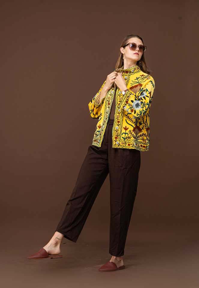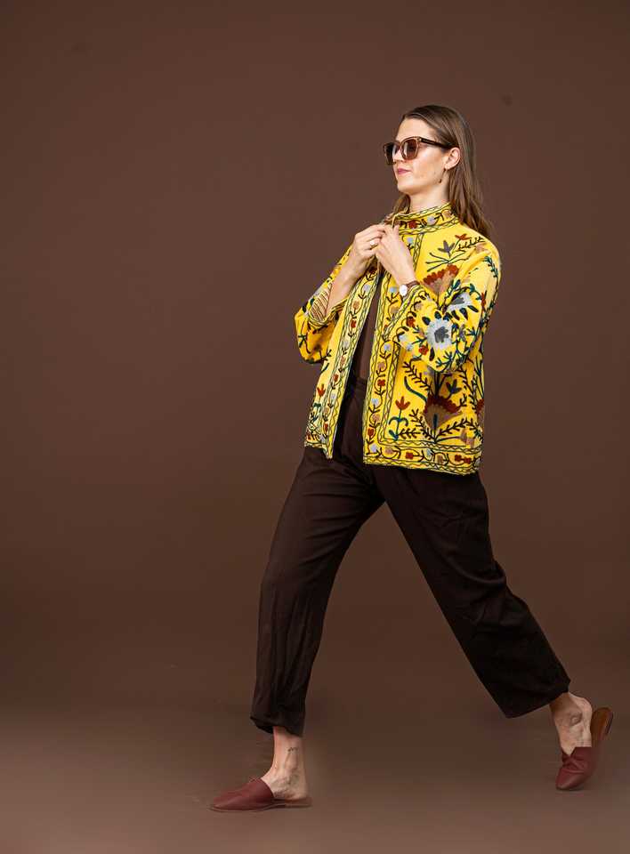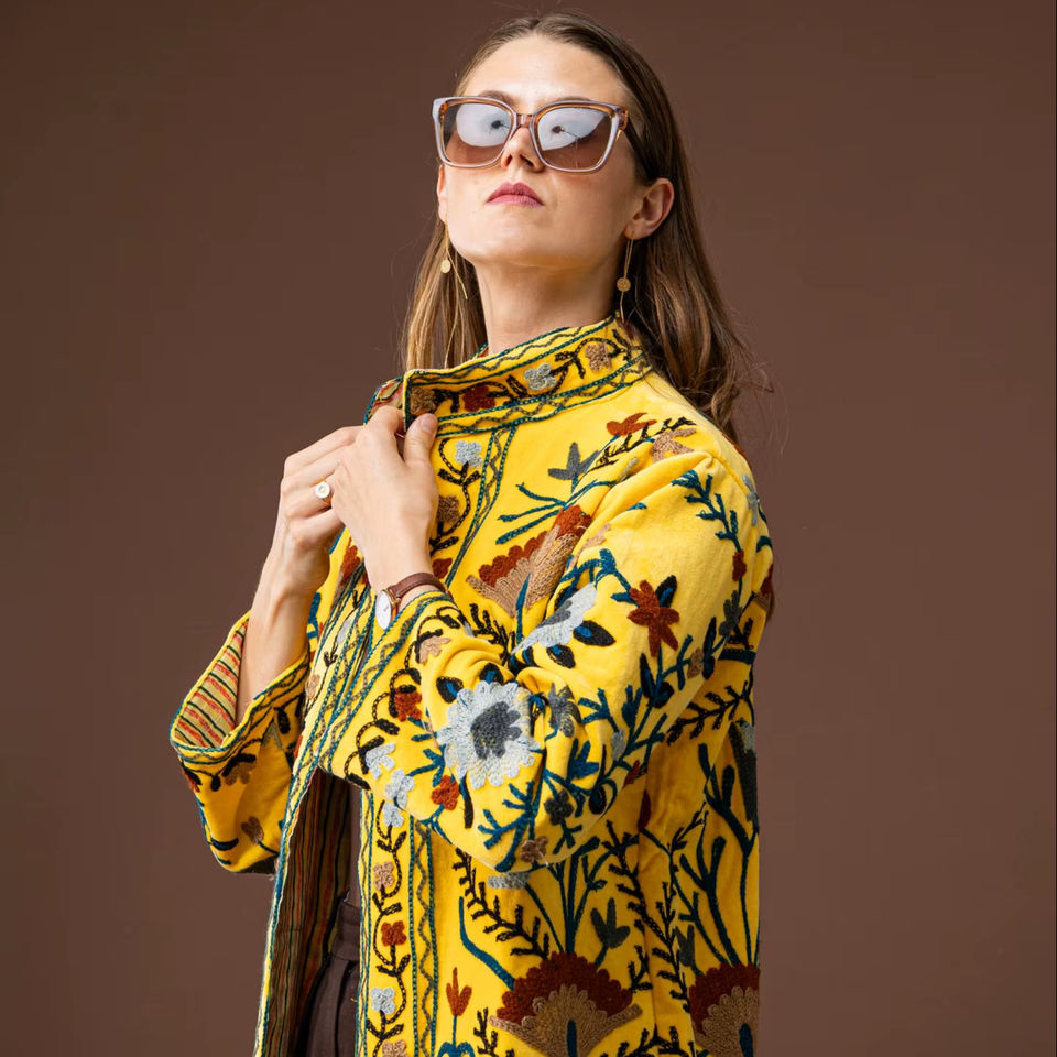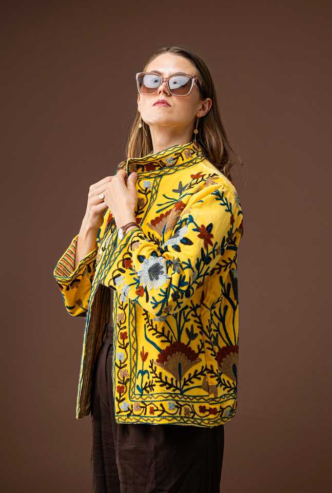 Nueva Chaqueta Acolchada de Lona Bordada a Mano de Moda Invernal Suzani, Ecológica, Última Moda en Ropa Boho Chic Amarilla para Mujer