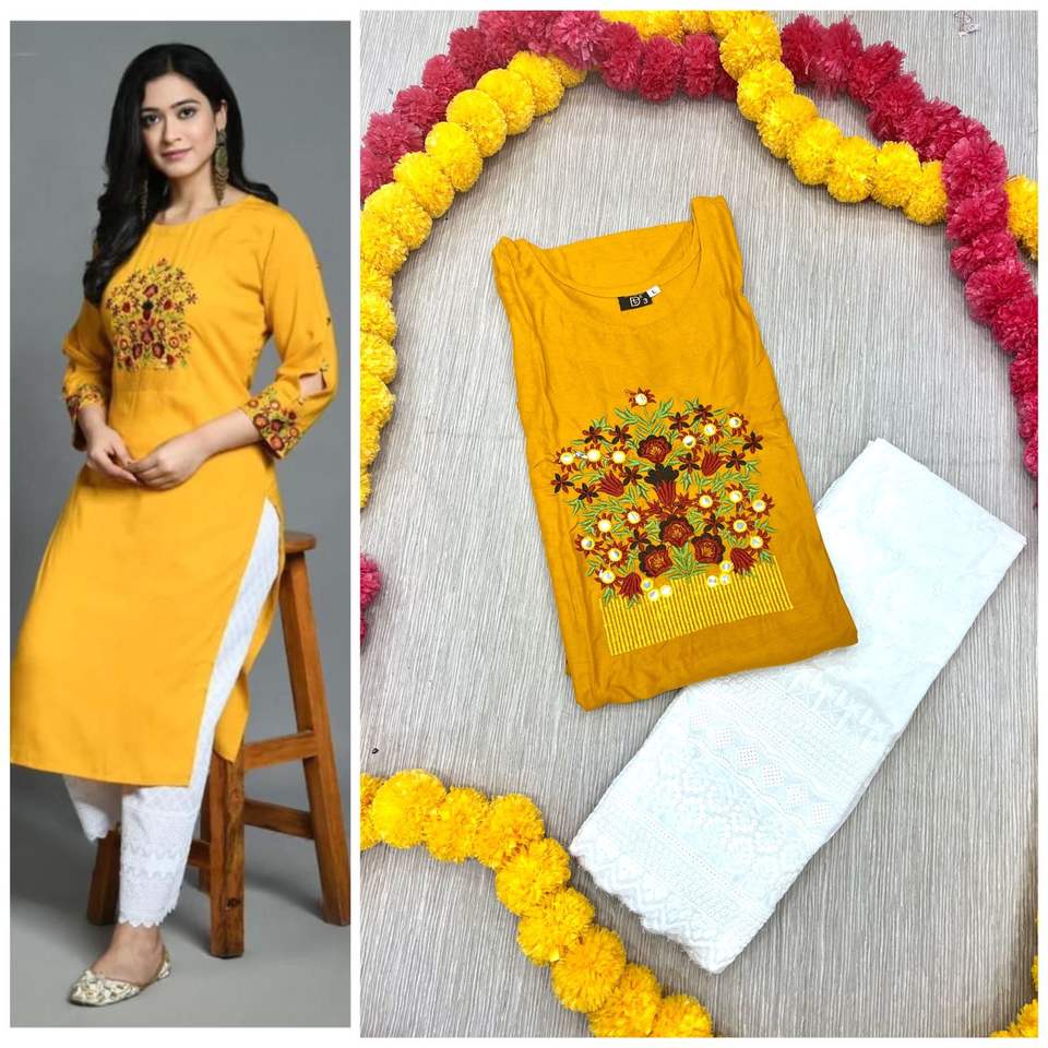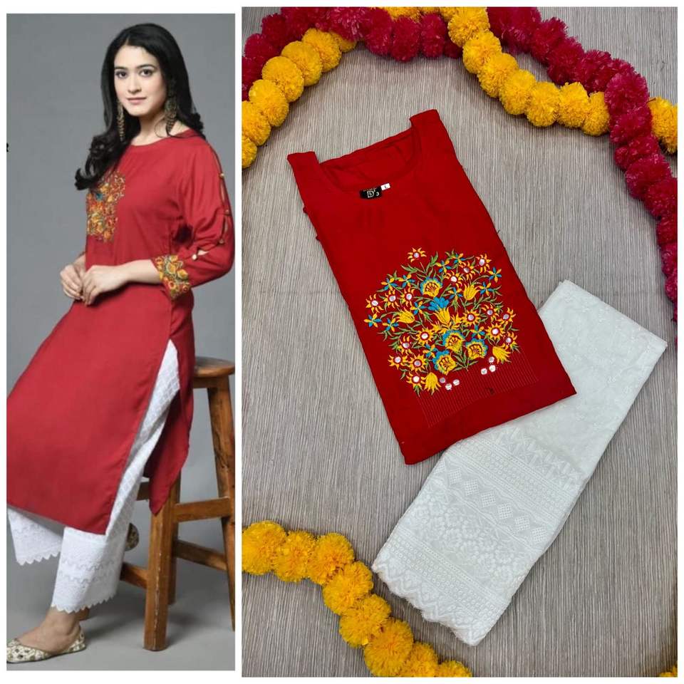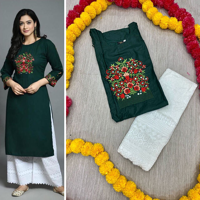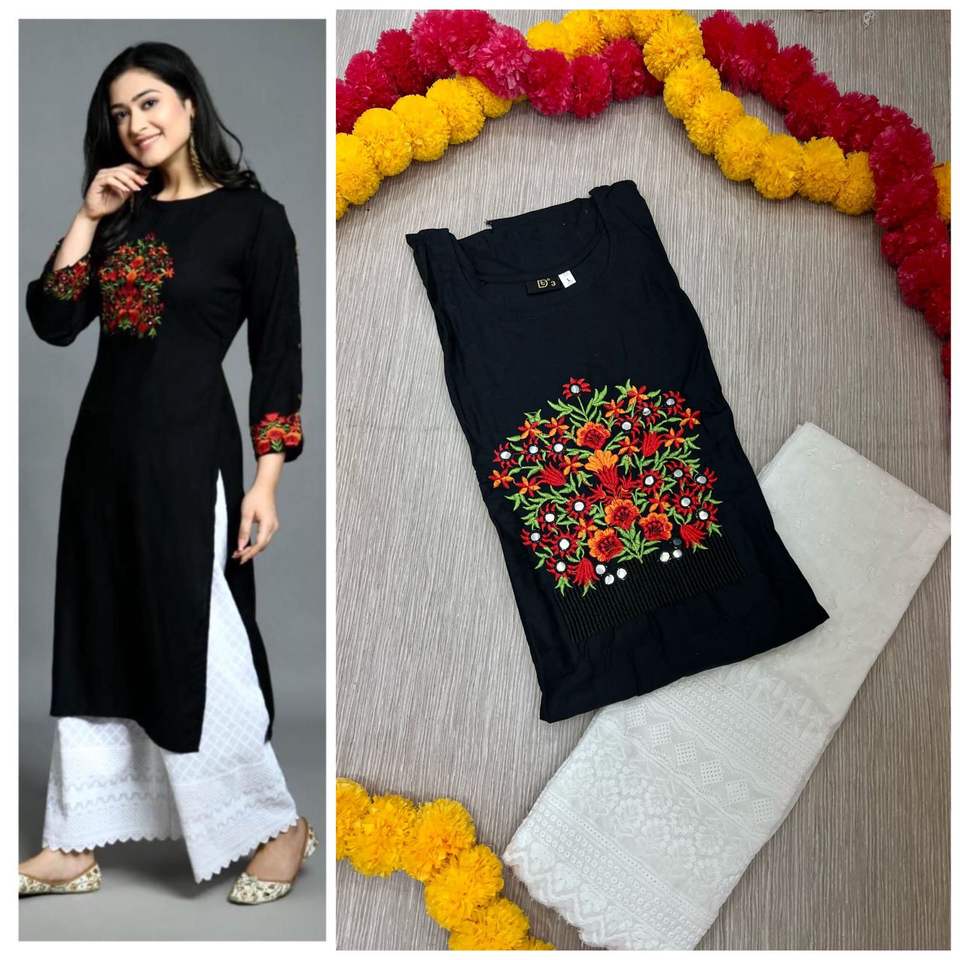 Diseño:Reyon de bordado de algodón Kurta con tela Palazzi conjuntos