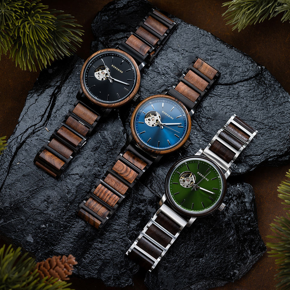 Nueva moda reloj mecánico de madera de acero inoxidable para hombres logotipo personalizado bajo MOQ Dropshipping correa de cuero personalizada característica hueca