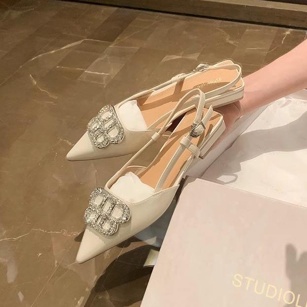 Nuevos zapatos de boda Novia Slingbacks Rhinestone Metal Punta estrecha Verano Lujo Femme 2025 Sandalias de tacón bajo para mujeres y damas