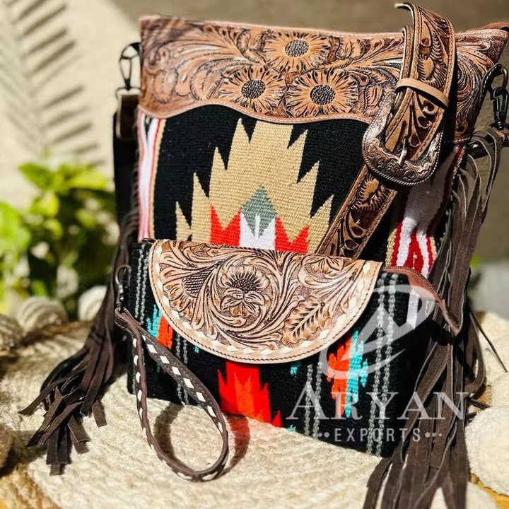 Nuevo bolso de cuero con herramientas aztecas de estilo tradicional occidental, bolso de hombro colorido para mujer y bolso de mano, conjuntos combinados únicos