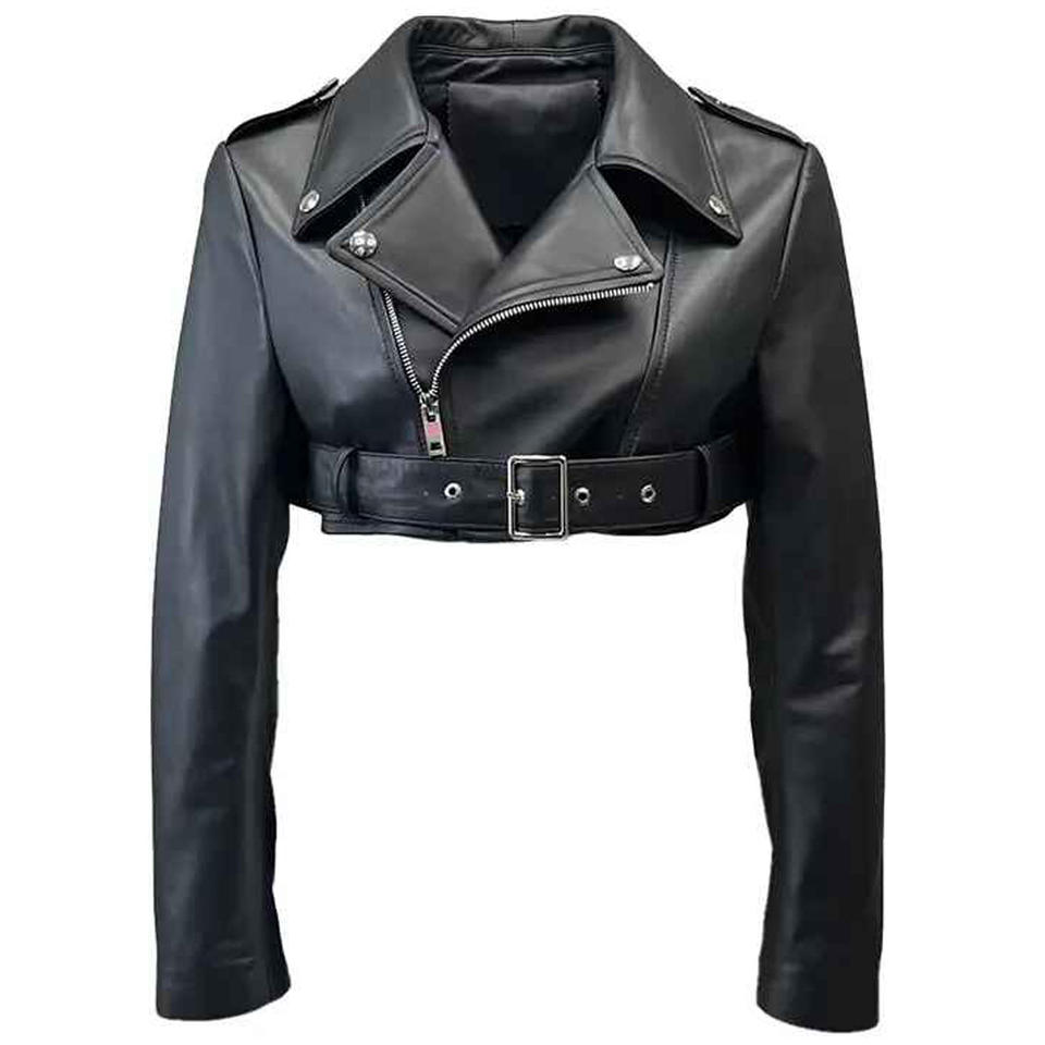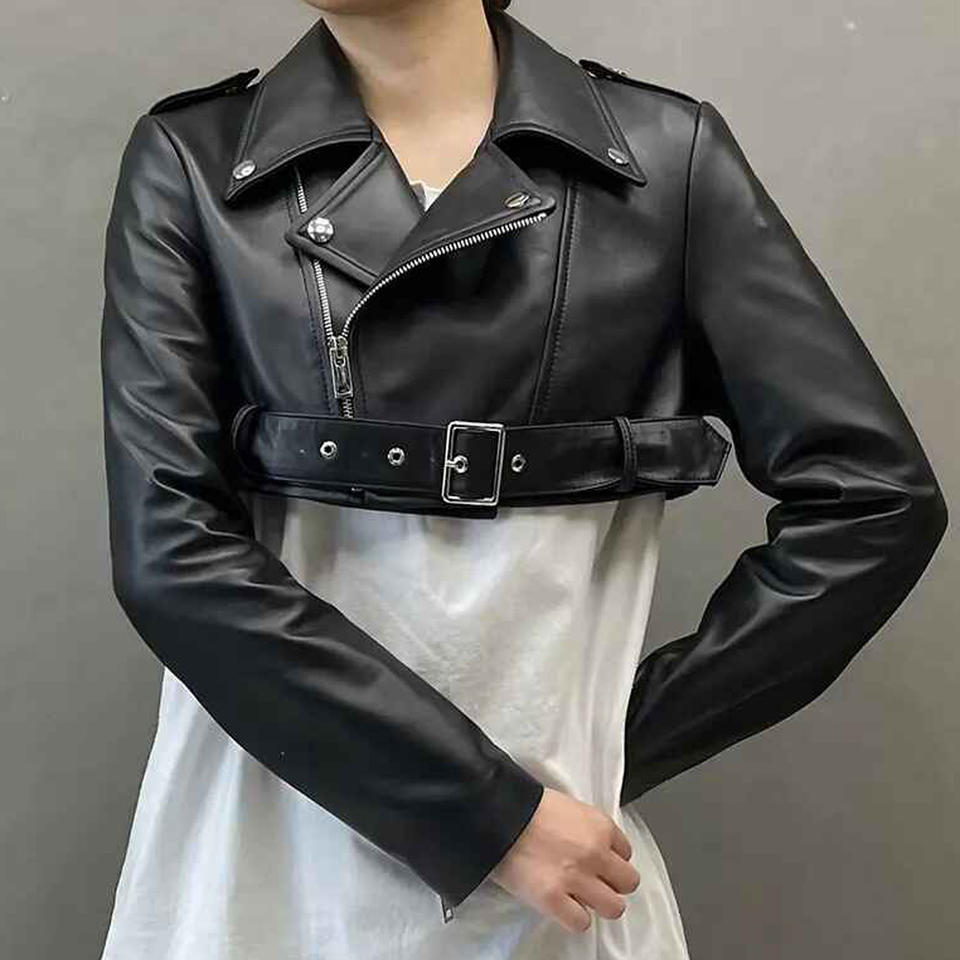 Nueva temporada de invierno 2025, chaqueta de cuero de motorista de diseño personalizado para mujer, chaqueta recortada Vintage con cuello vuelto de estilo lujoso para mujer