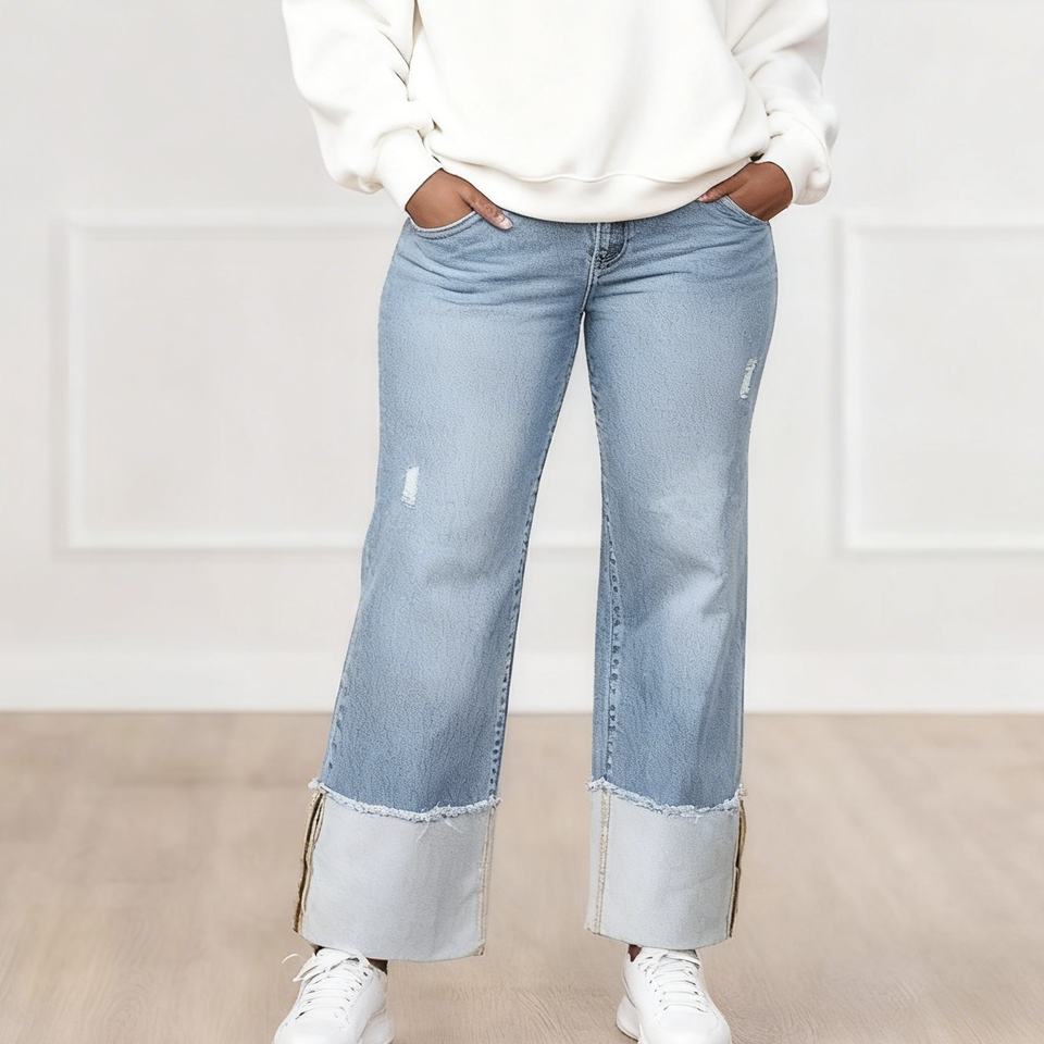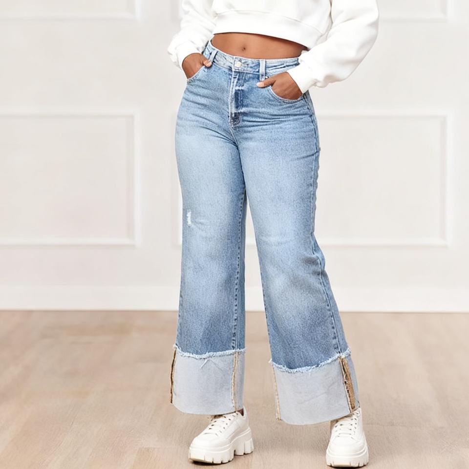 Nuevos Pantalones de Mujer de Color Puro Lavado con Dobladillos Plegables y Jeans Largos Ajustados a la Cadera, a la Moda