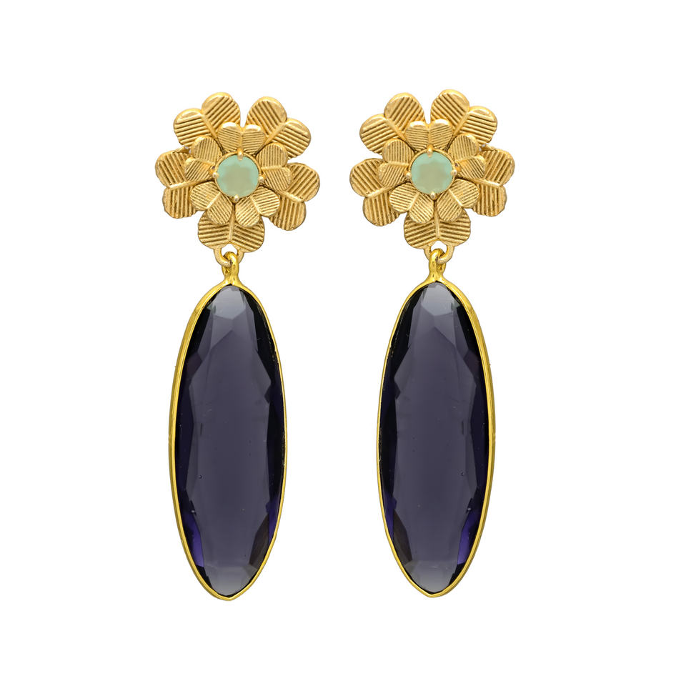 Recién llegado, Pendientes colgantes de diseño único chapados en oro con pendientes de latón con piedras preciosas de amatista