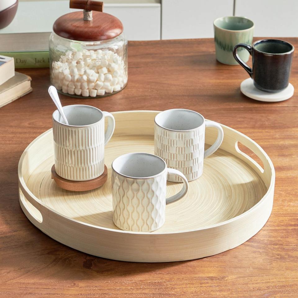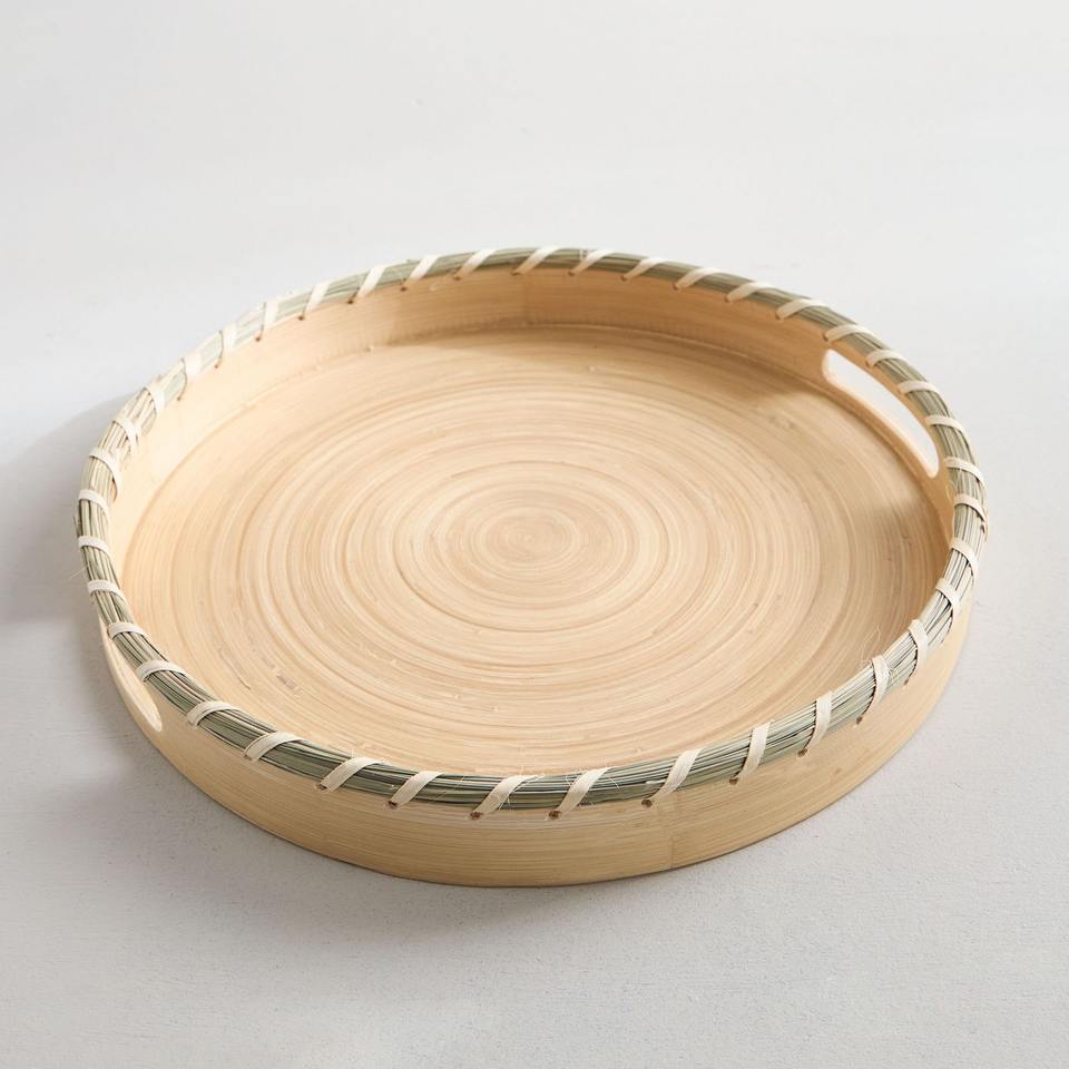 Bandeja de bambú hilada en espiral de nuevo diseño con asas recortadas, accesorios de mesa de precio más barato, bandejas en espiral versátiles
