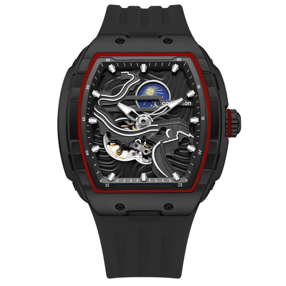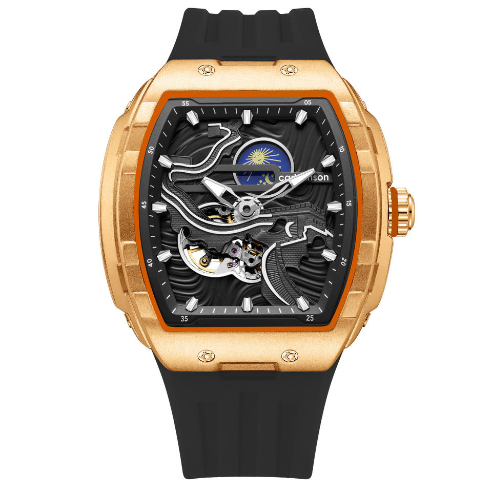 Nuevo reloj esqueleto para hombre, reloj de pulsera de cuarzo con correa de silicona resistente al agua luminosa en forma de tonel
