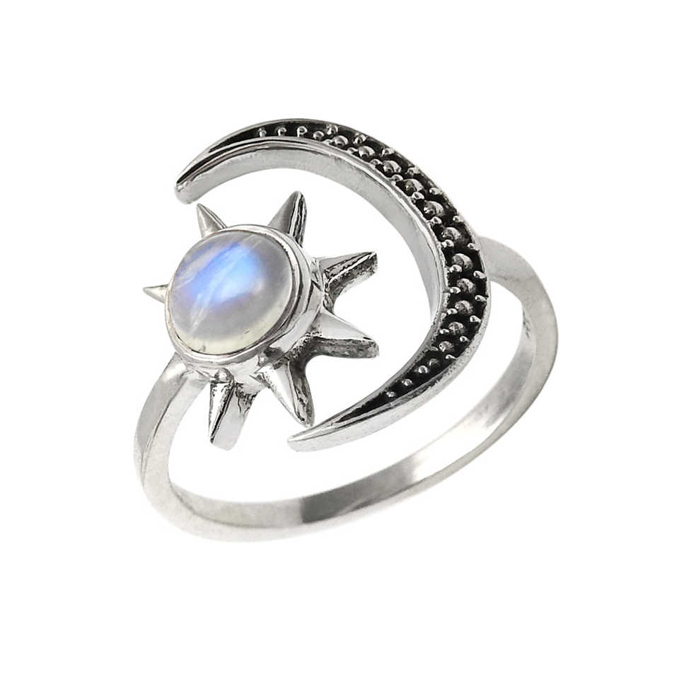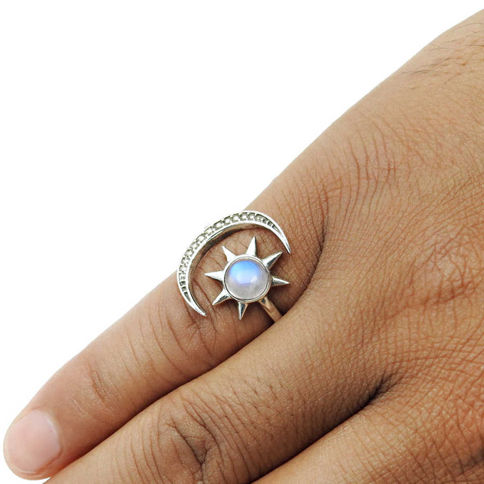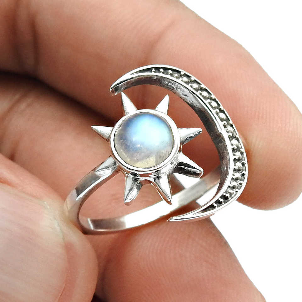 Anillos de Diseño Novedosos con Piedra Lunar Arcoíris Curativa, Cuentas de Gemas, Sol y Luna Creciente, Anillos de Plata Hechos de Plata de Ley 925