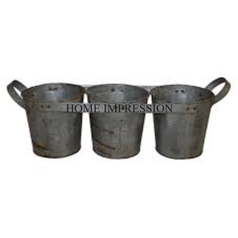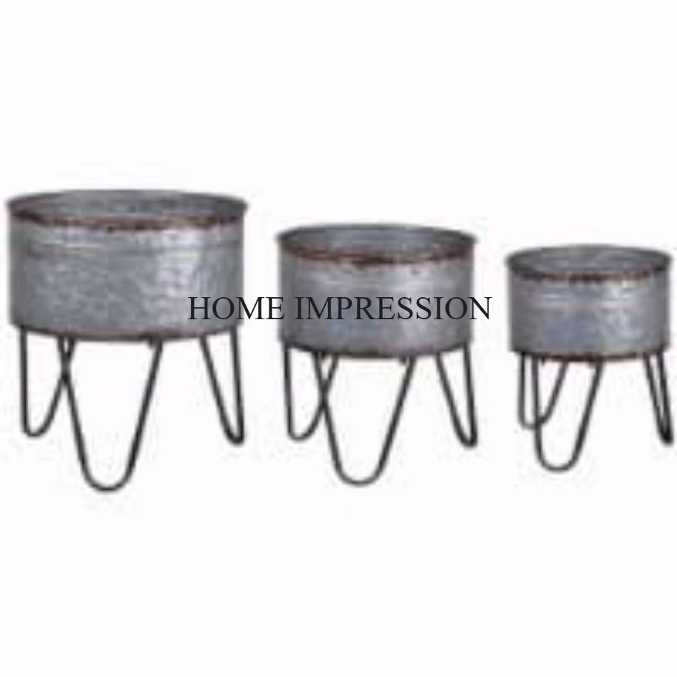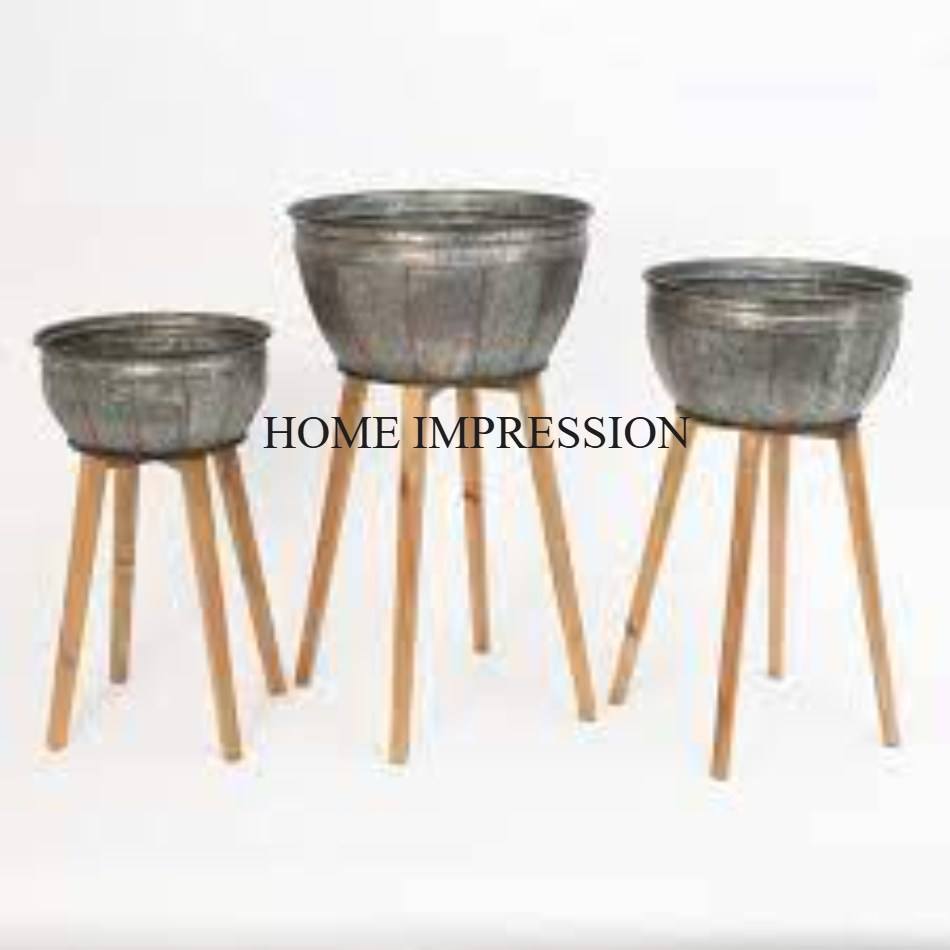 Macetas de Material galvanizado de forma redonda de diseñador más nuevo con soporte de madera, artículos para fiesta de boda, maceta creativa para decoración de flores