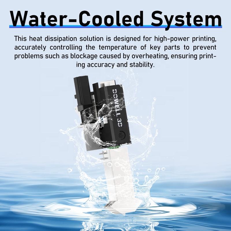 Sistema de enfriamiento por agua: El sistema de enfriamiento por agua asegura un control de temperatura constante, lo cual es crucial para mantener la calidad y estabilidad de las impresiones a gran escala.