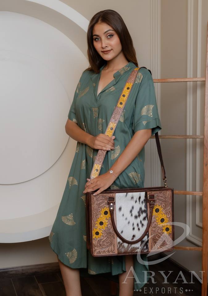 Product Name:Hair-On & Tooled Leather Sunflower Tote Bag