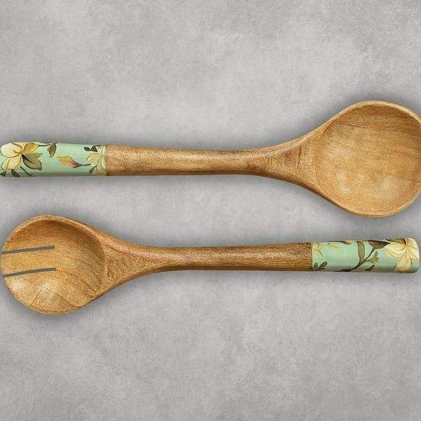 Juego de servidores de ensalada de esmalte de nuevo diseño, madera natural con mango impreso en esmalte, cubiertos para servir ensalada a precio de fábrica al por mayor.