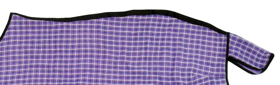 Alfombra de verano hecha de tela de panal de miel con refuerzo de hombro. Dos cierres de hebilla de metal delanteros. Dos medios surcingles. Dos correas para las piernas con correa de bucle trasero.
