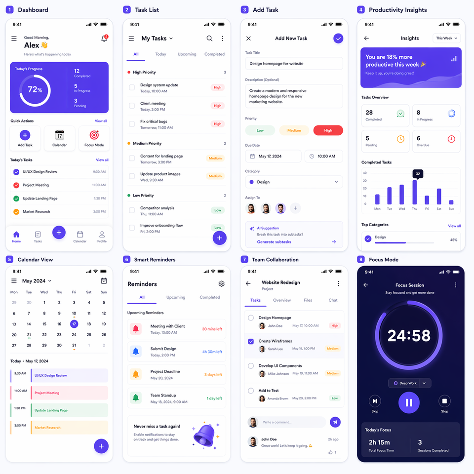 Aplicación Móvil de Gestión de Tareas de Última Generación con Programación Inteligente, Automatización e Información sobre el Rendimiento