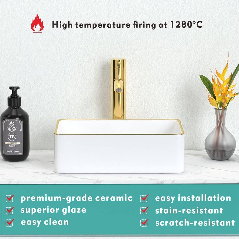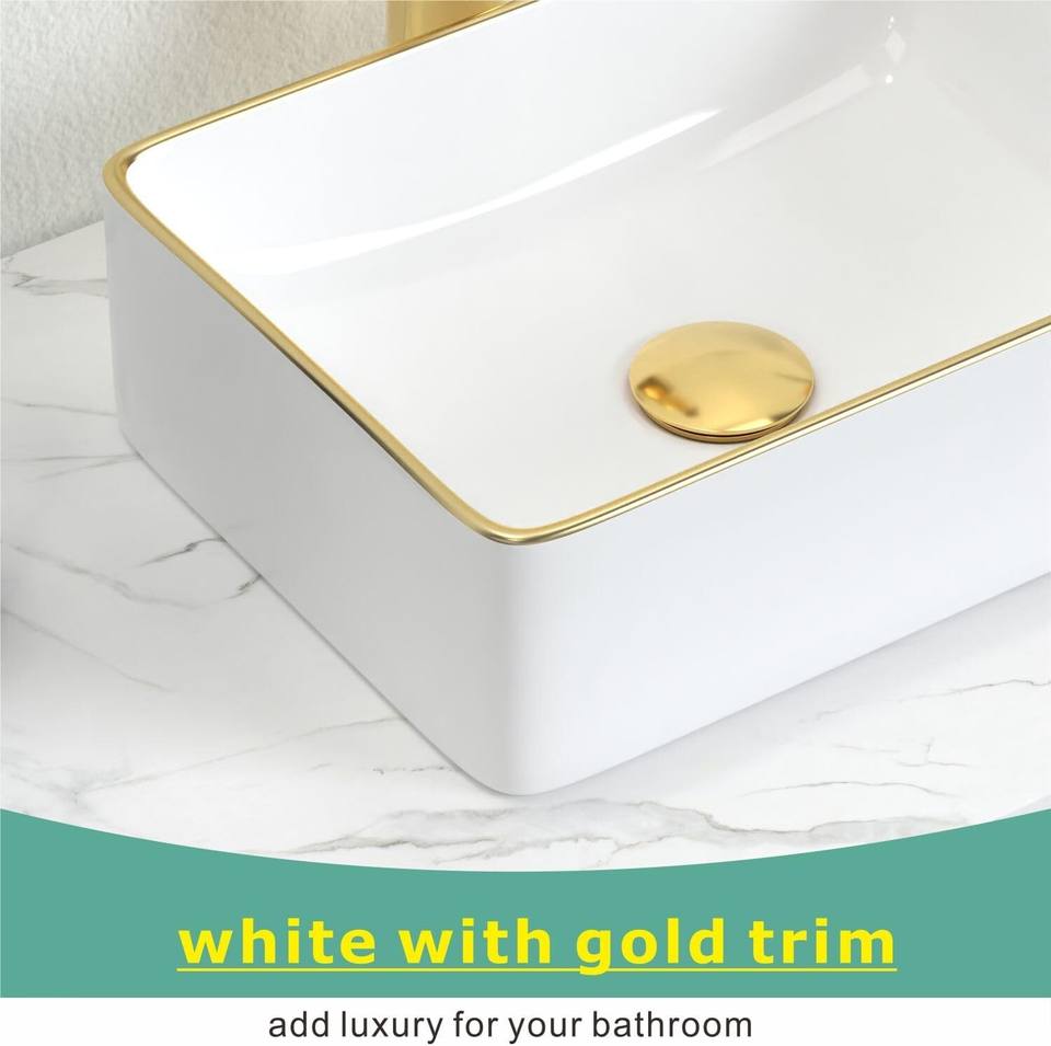 Bonito diseño, adorno dorado, Forma cuadrada Rectangular, lavabo de cerámica, encimera, lavabo decorativo, baño, lavado a mano, lavabo