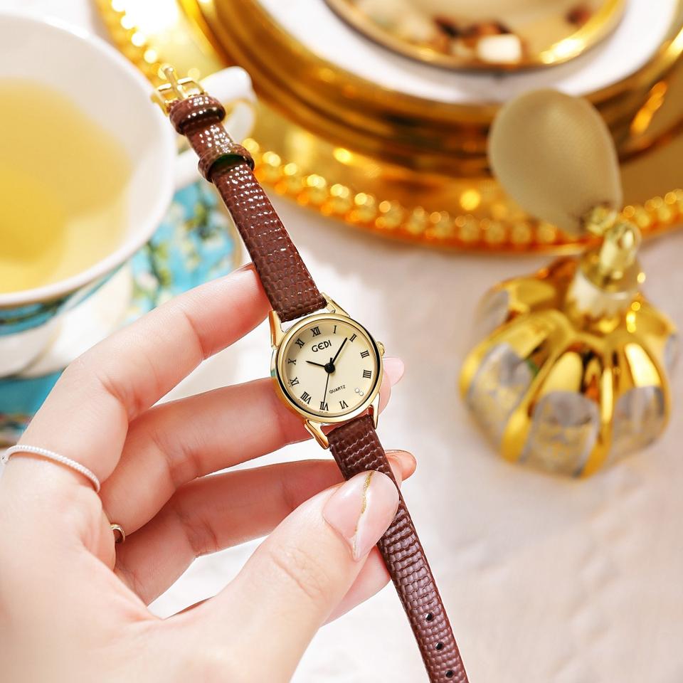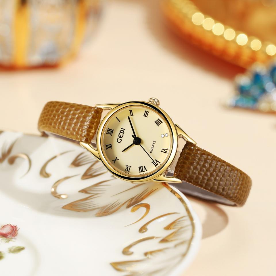 Reloj Retro de Mujer con Bisel Dorado Delgado y Marcadores Romanos, Correa de Cuero Genuino, Reloj de Cuarzo