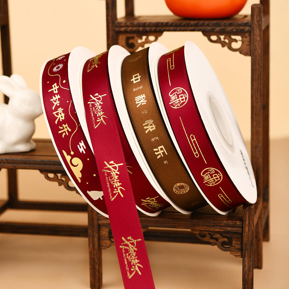 Nine-Colored Ribbon Mid Autumn Festival Satin Ribbons Gold Stamp Printed Decorative Gift Packaging 3Mm 6Mm 10Mm 15Mm