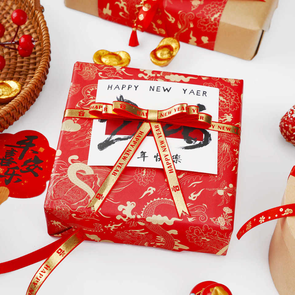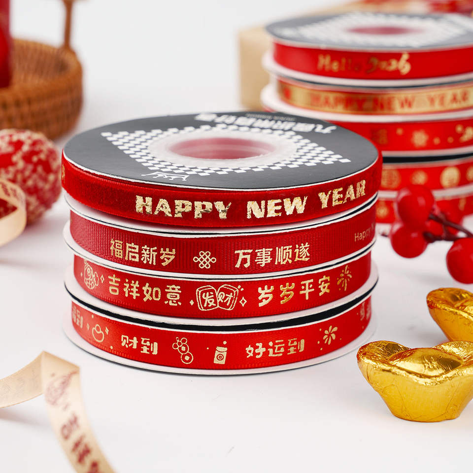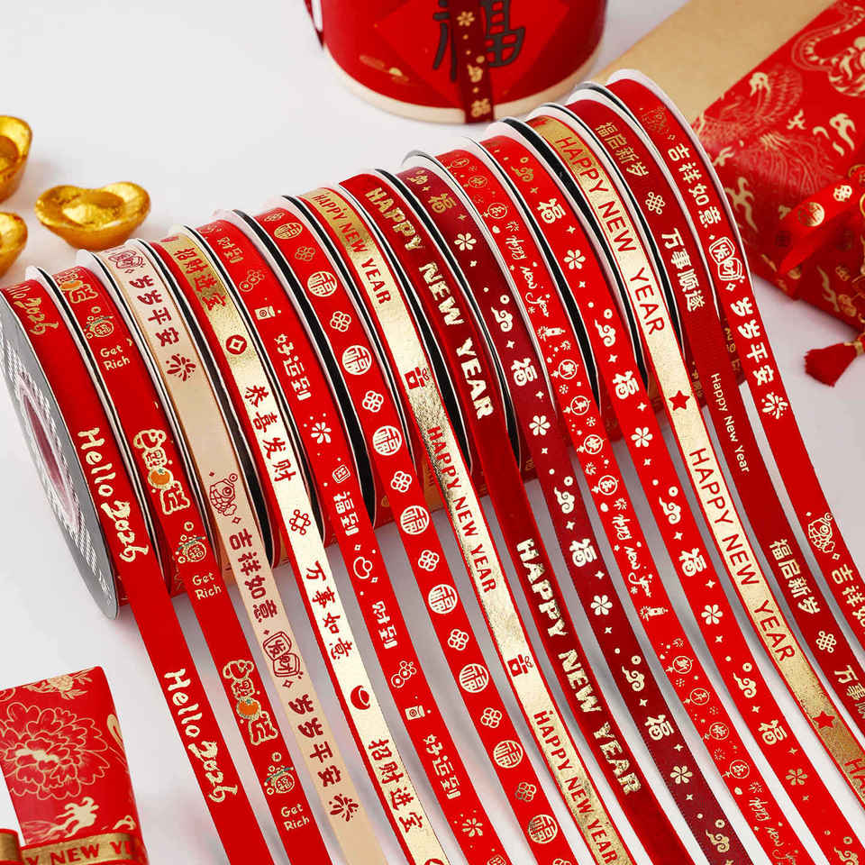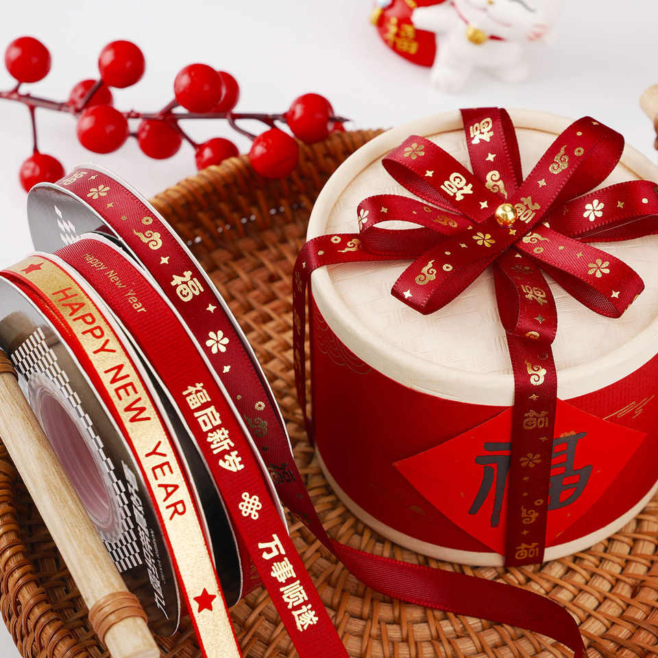 Nine-Colored Ribbon New Year Red Satin Ribbon 1Cm Gold Stamp Printed For Gift Wrapping Spring Festival Decorative