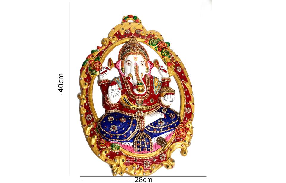 Artesanía Nirmala, Decoración de Pared Ovalada Religiosa Multicolor de Metal Hecha a Mano con Ganesh de Rajasthan, para Regalo Corporativo