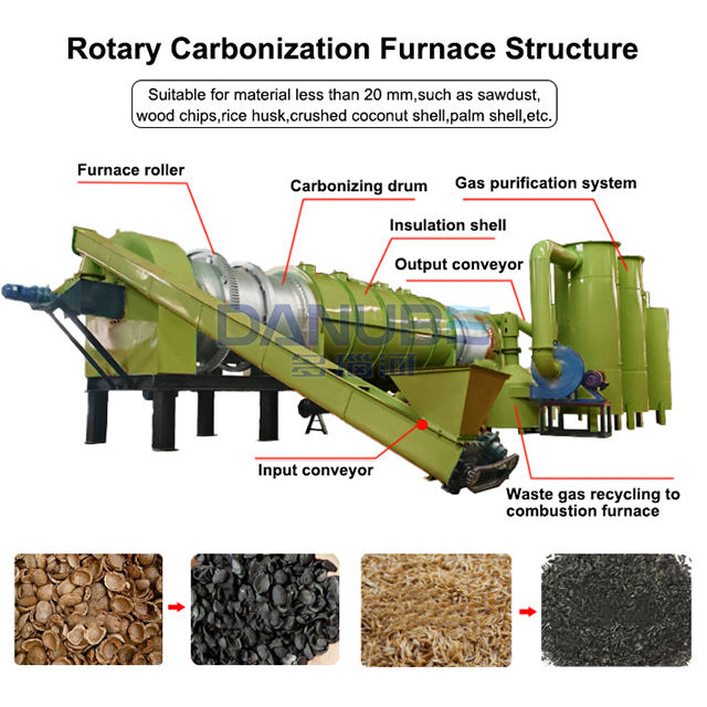 Materias primas aplicables:Cascarilla de arroz, aserrín, madera, cáscara de coco, cáscara de nuez, mazorca de maíz, etc.