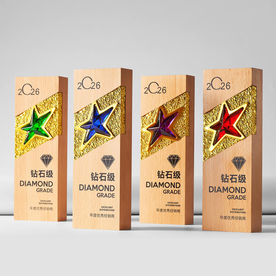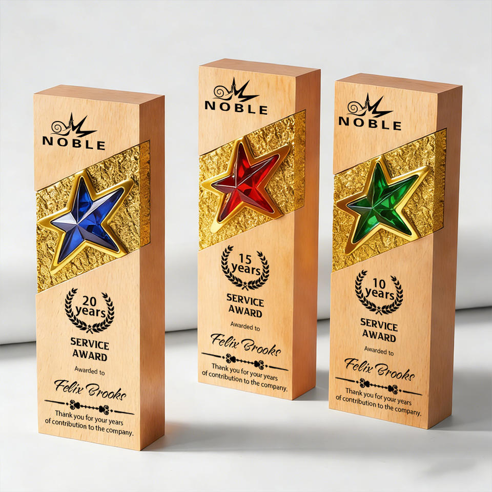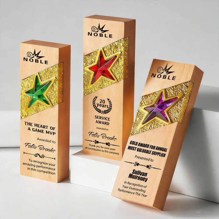 Trofeo de Madera Noble Personalizado, Premio de Madera Natural con Insignia de Estrella Metálica para Reconocimiento de Servicios Corporativos MVP