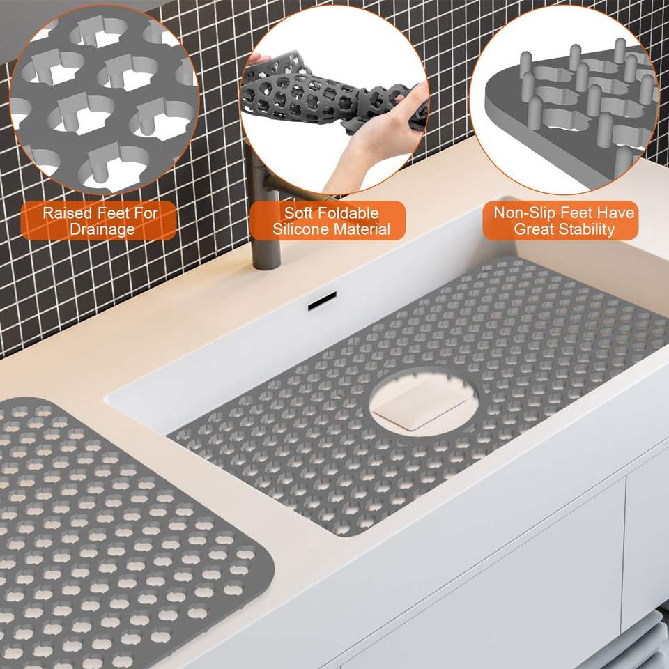 Protector Antideslizante para Fregadero de Cocina de Acero Inoxidable con Orificio de Drenaje Central y Rejilla de Silicona