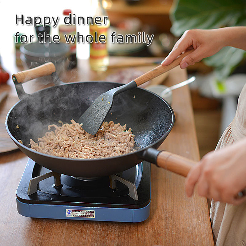 Wok antiadherente, venta directa de fábrica, wok para freír de hierro fundido presazonado con tapa de madera para restaurante o uso doméstico
