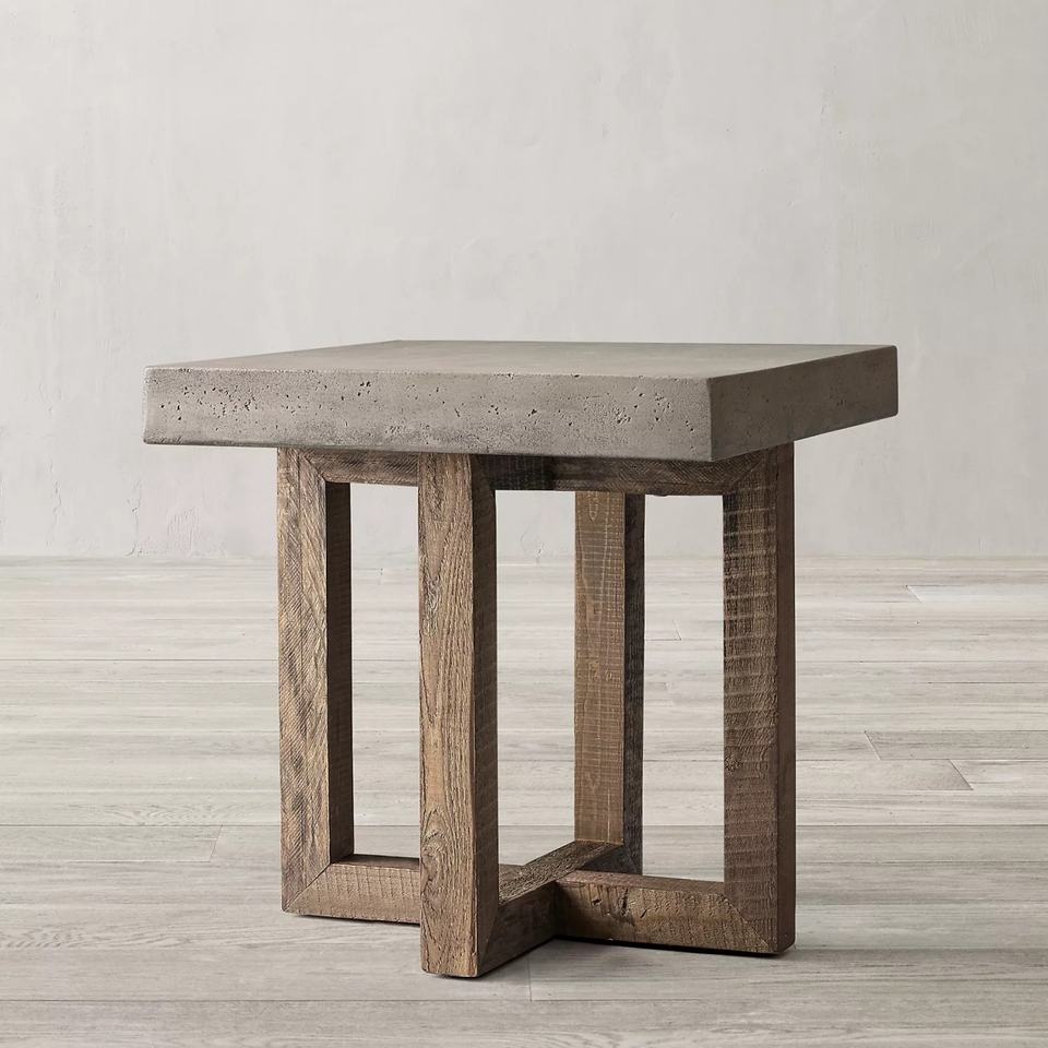 Mesa auxiliar cuadrada de madera maciza con base de hormigón para salón americano pequeño.