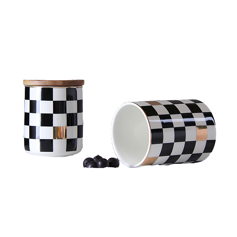 Tarro de Almacenamiento de Cerámica con Patrón de Tablero de Ajedrez Nórdico y Tapa de Madera para Café, Té, Cosméticos, Alimentos, Regreso a Clases, Recipiente para Gatos