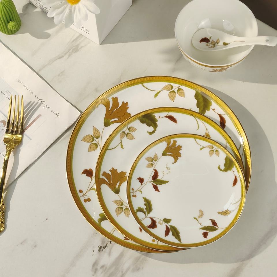 Juego de 5 Platos y Cucharas de Porcelana de Hueso con Diseño de Flores Doradas Nórdicas