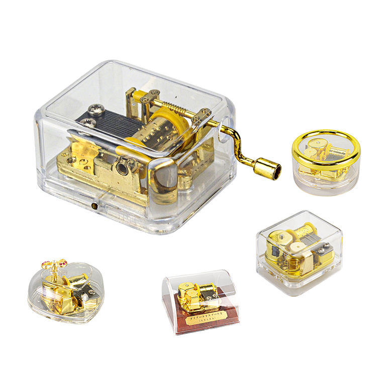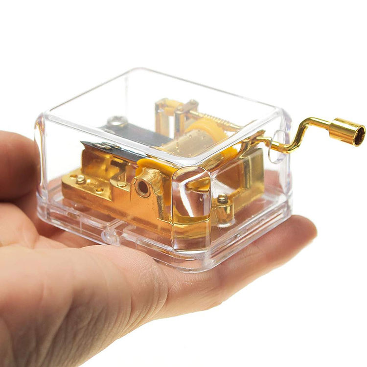 Caja de música de acrílico transparente con movimiento dorado de manivela