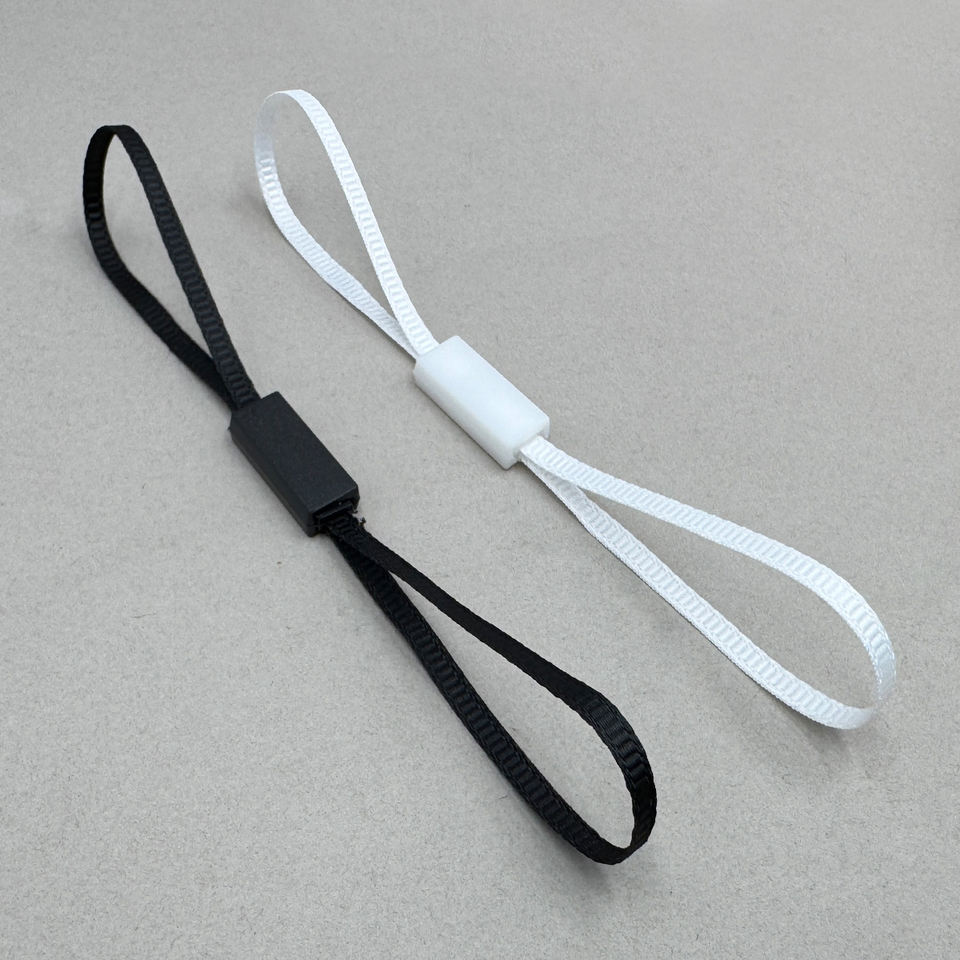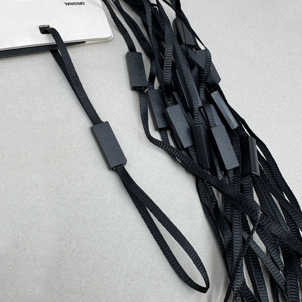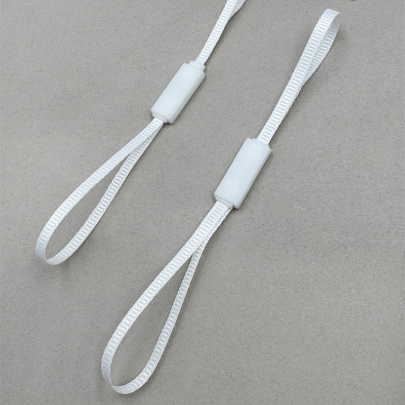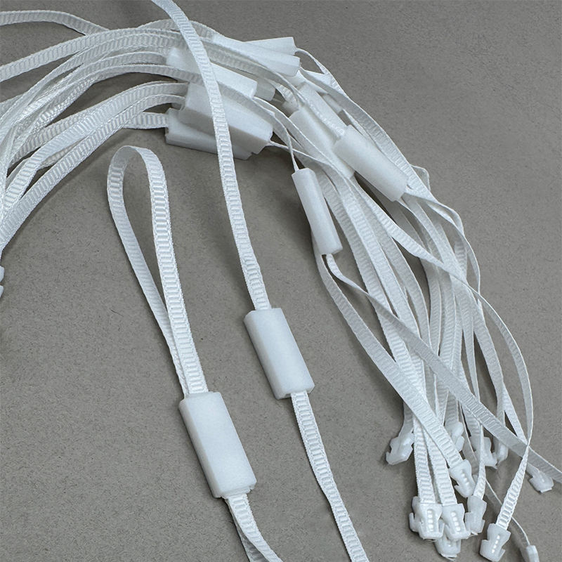 Cuerda de nailon con hebilla manual para cerrar etiquetas colgantes de plástico selladas, cuerda para anillas de etiquetas, cuerda para etiquetas colgantes con cierre de cinta de satén para ropa