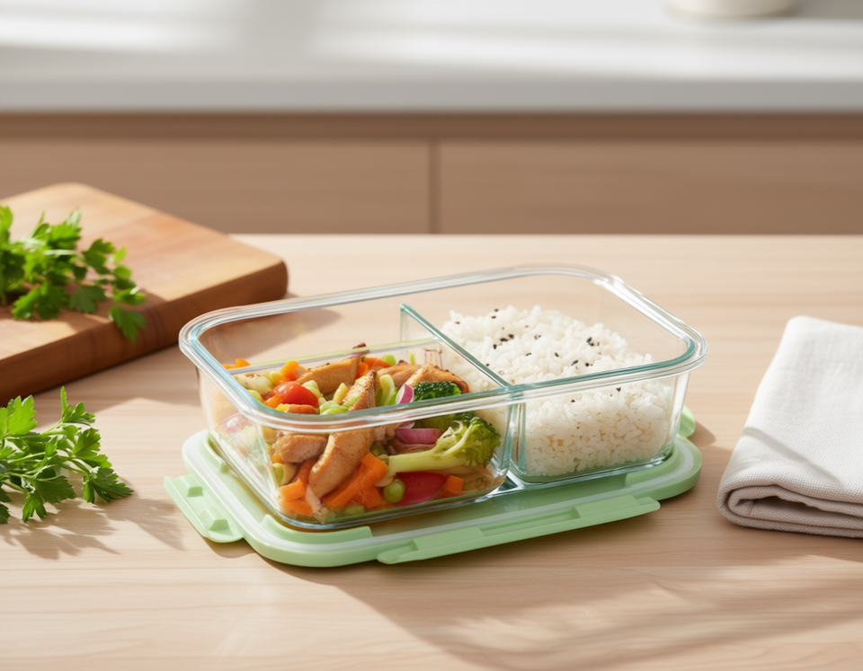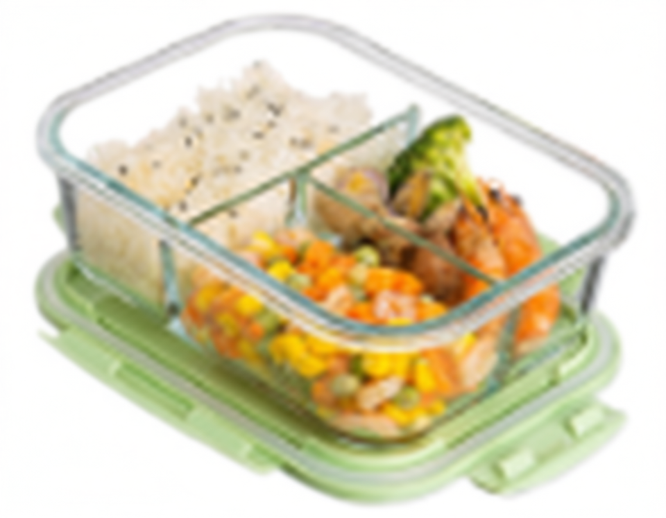 Recipiente de Vidrio Grande O8 de 1040 ml con Tres Compartimentos, Apto para Microondas, para Uso en la Cocina