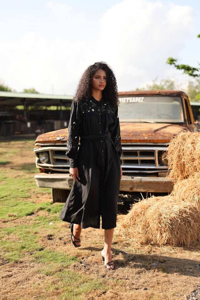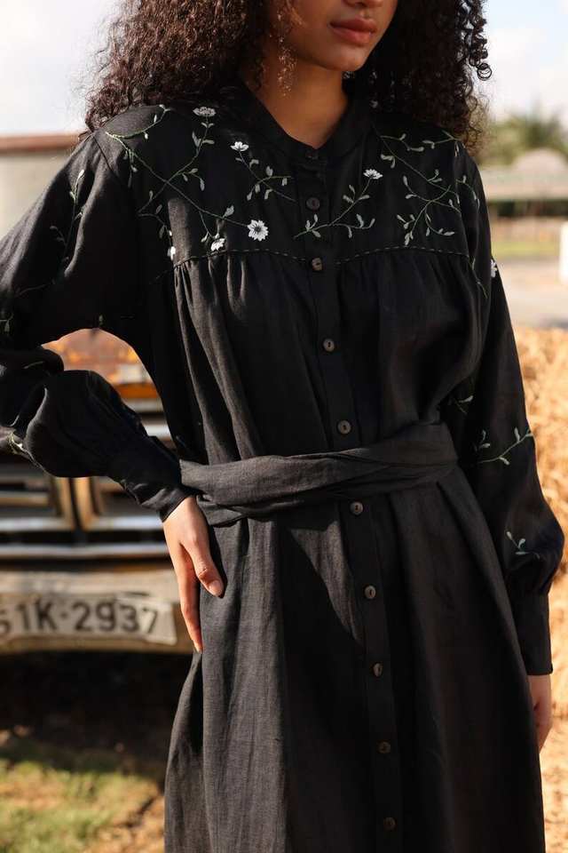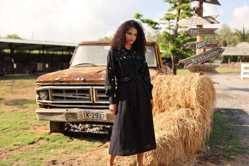 ODESSA Vestido camisero de lino con bordado a mano Botón frontal Vestido largo floral para mujer