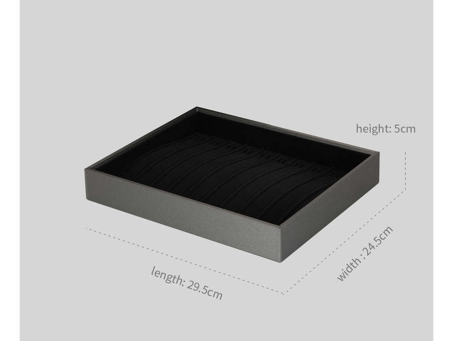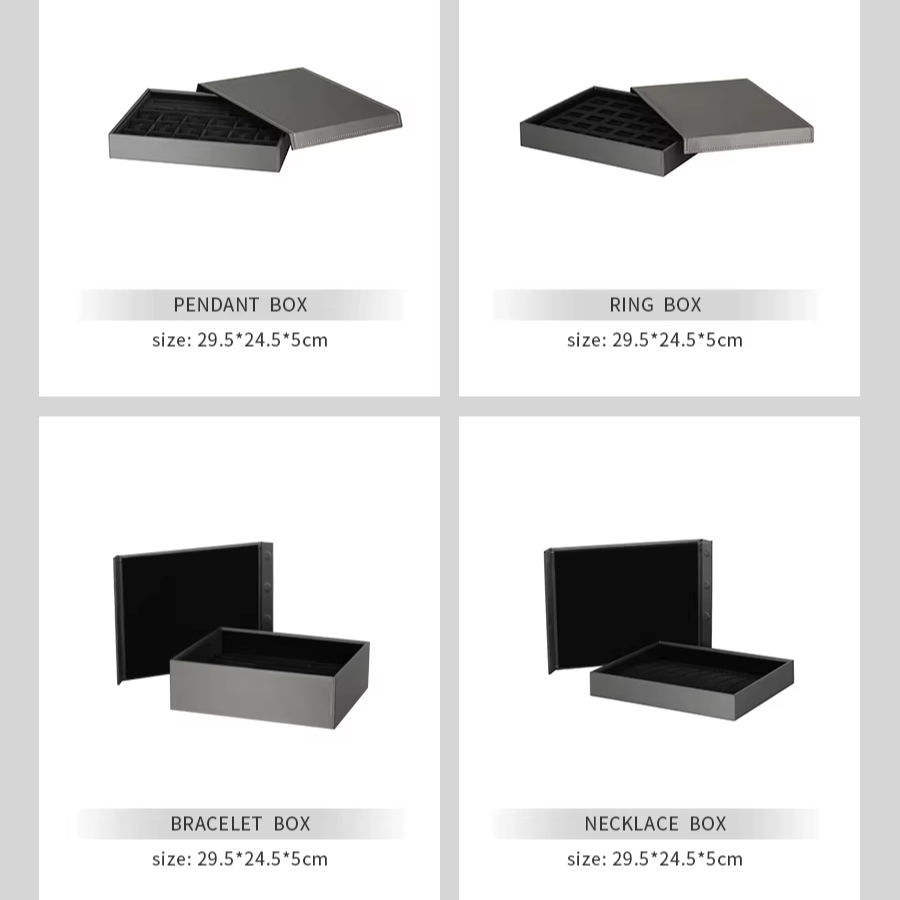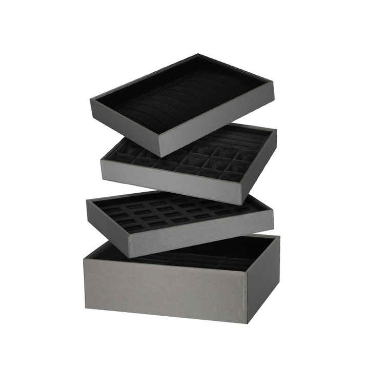 Bandeja de exhibición de joyería moderna y elegante ODM, bandejas de terciopelo apilables, juego de exhibición de joyería gris personalizado