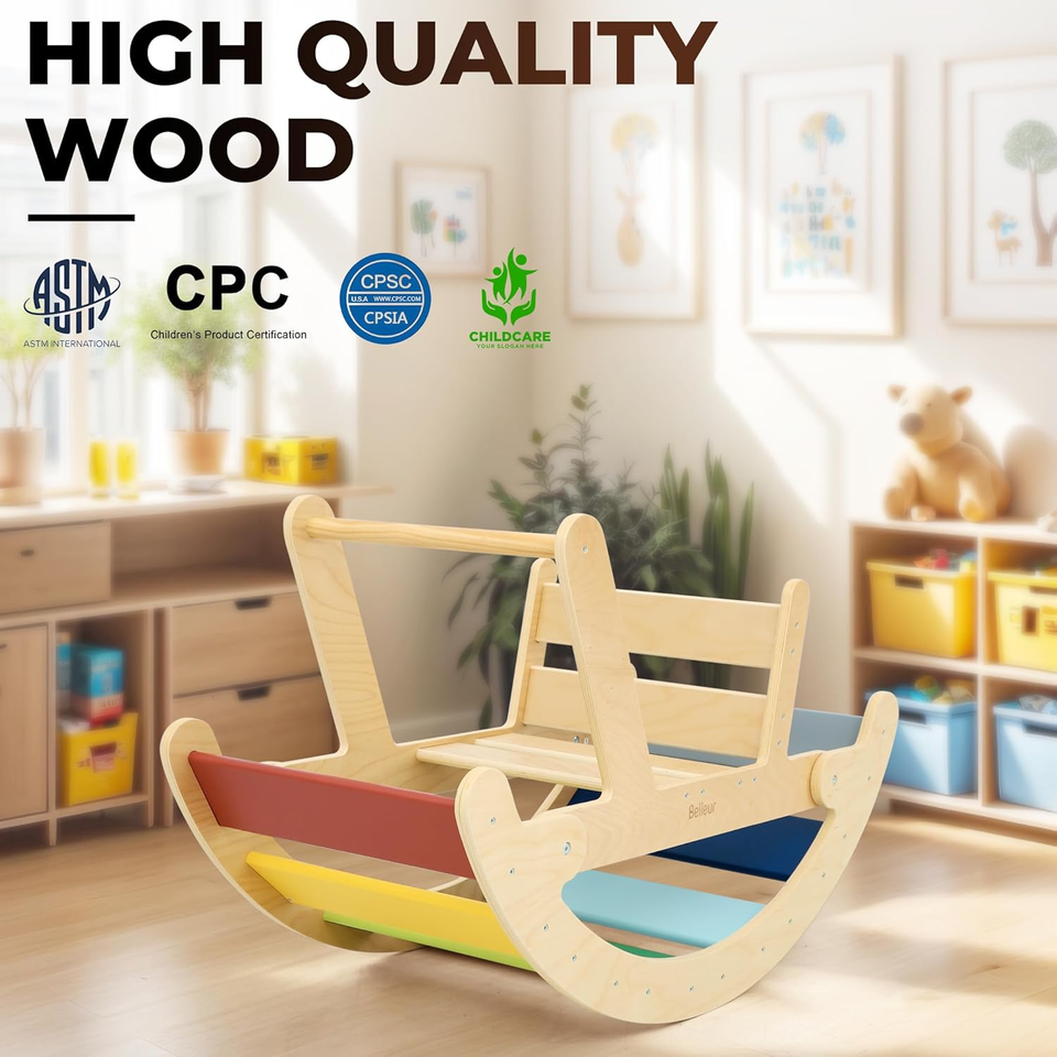 ODM OEM clásico arco arcoíris de madera balancín mango alto respaldo Montessori juguete gran caballo balancín para niños pequeños 1-5 años juguete