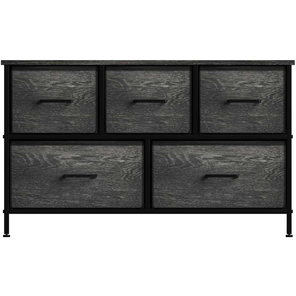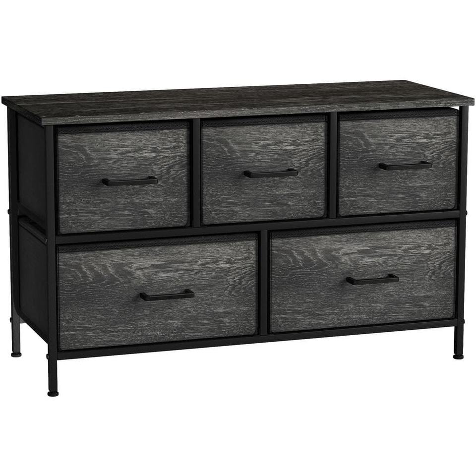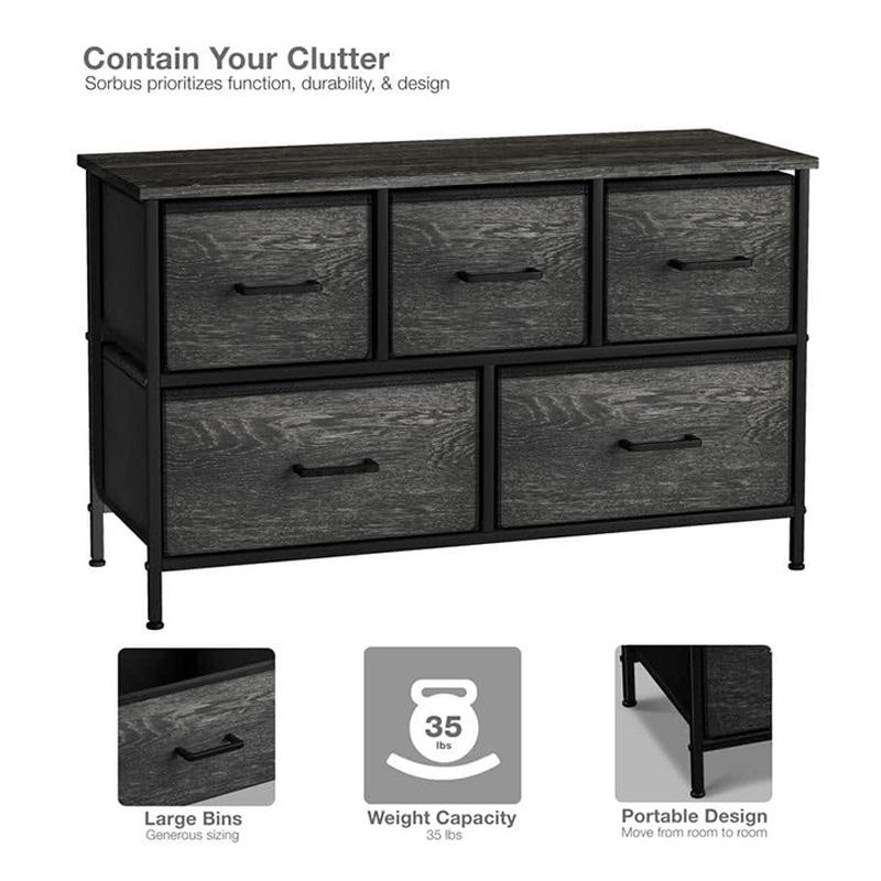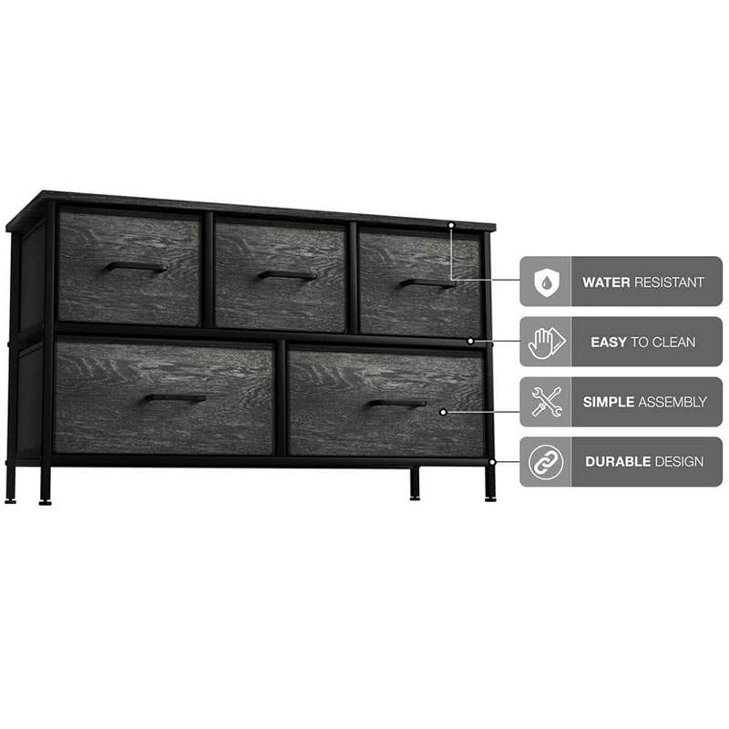 Cómoda moderna de 5 cajones con contenedores de tela fáciles de tirar ODM OEM marco de acero negro Tapa de madera para dormitorio escuela Villa sala de estar Hotel