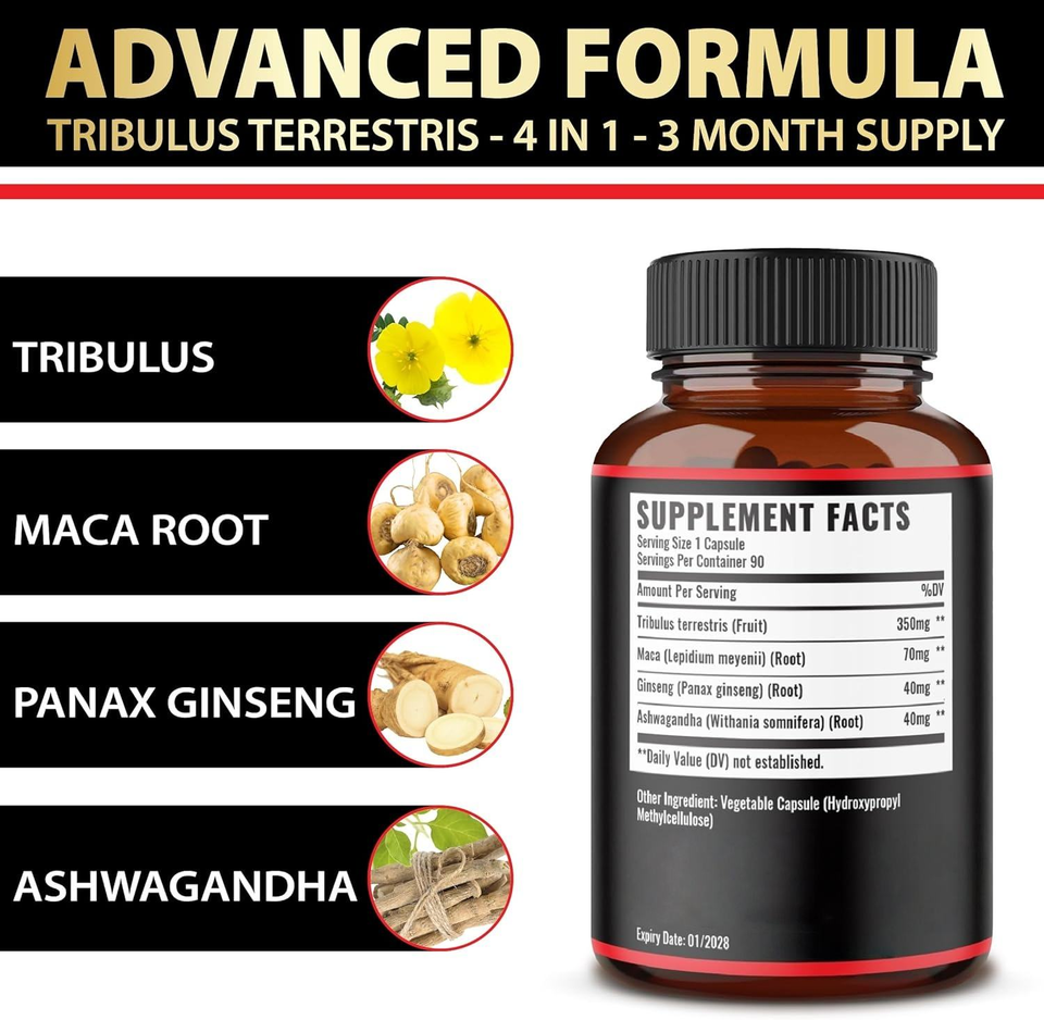 Tribulus terrestris (Fruit) 350mg, Maca (Lepidium meyenii)(Root) 70mg, Ginseng((Panax ginseng) (Root) 40mg, Ashwagandha (Withania somnifera)(Root) 40mg