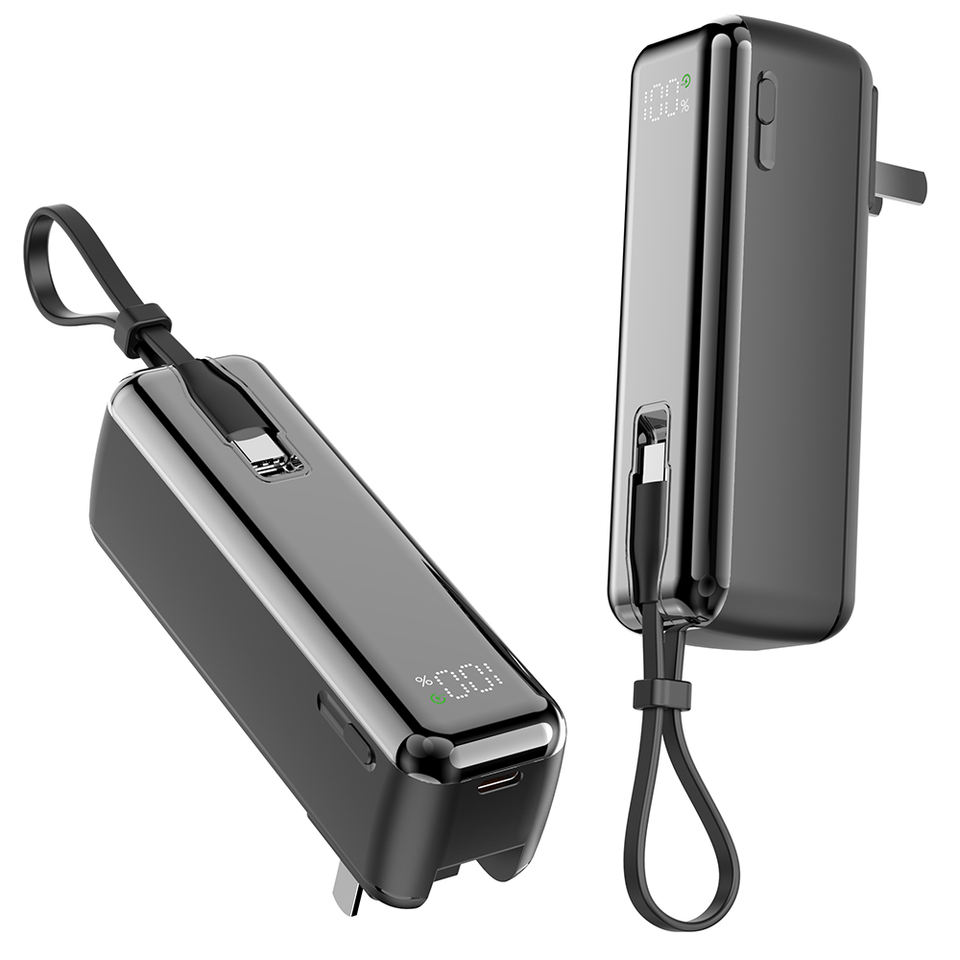 Batería Externa OEM de 5000 mAh con Enchufe de CA Integrado y Cable con Cordón - Carga Rápida de 22.5W, USB C PD, Pantalla Digital
