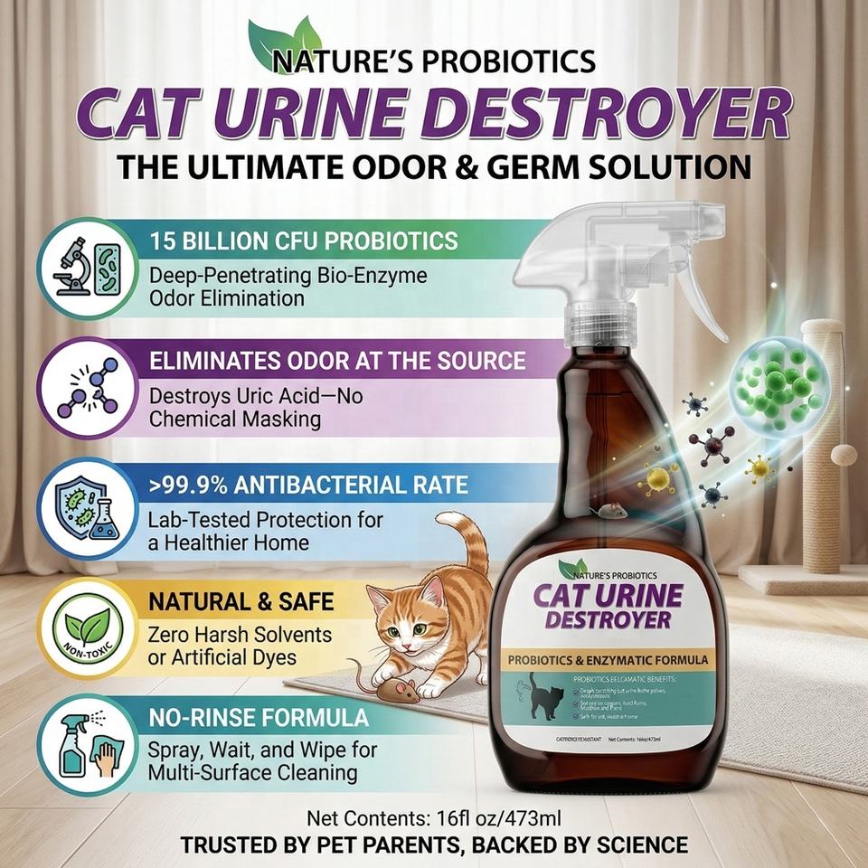 Eliminador de Olores para Mascotas con Probióticos 15B CFU, Spray Bioenzimático para Eliminar Olores de Orina de Gato en Alfombras y Pisos, Sin Enjuague, Personalizable OEM