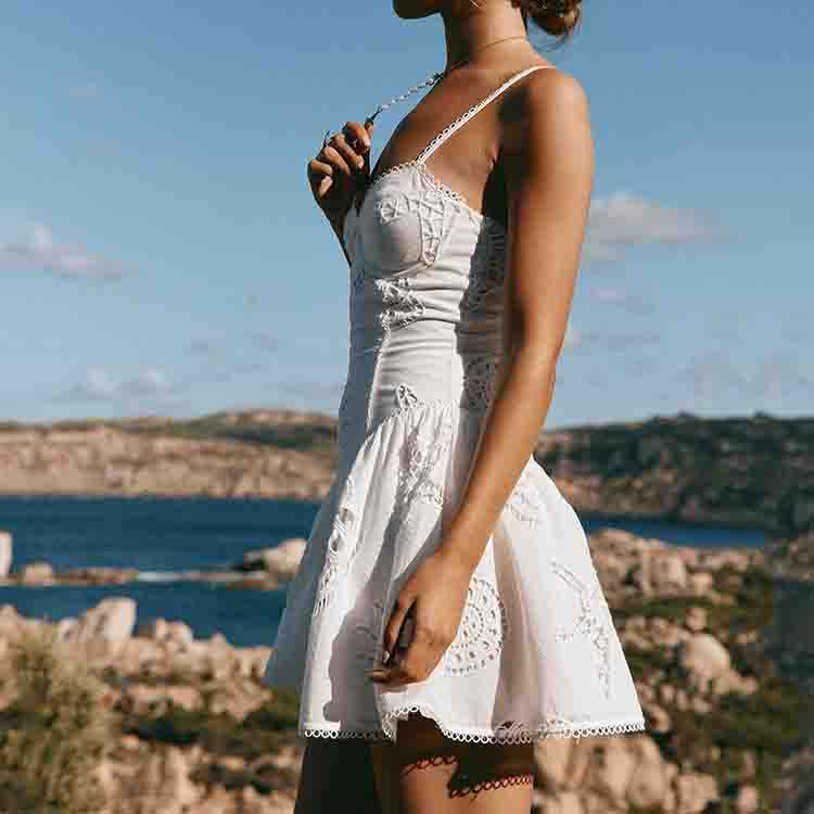 Vestido Mini Personalizado OEM, Estilo Retro de Playa, con Bordado Calado y Tirantes Acolchados, Alta Calidad, 100% Algodón