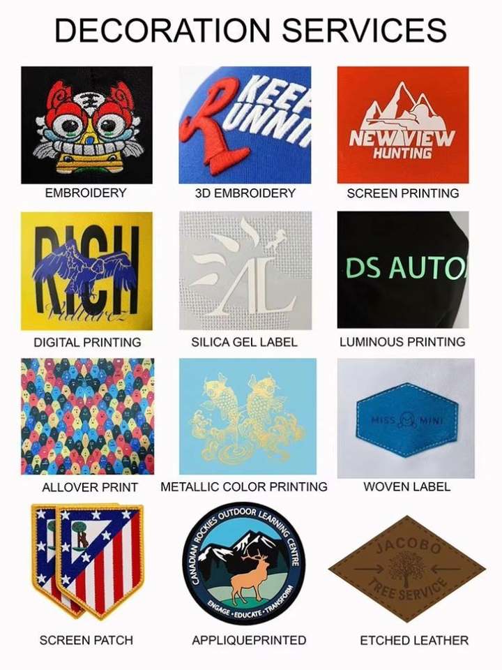 Técnicas:IMPRESIÓN DE PANTALLA DE SEDA, Impresión DE LA Transferencia de Calor, Bordado a máquina, Bordado a mano, Bordado de tela adherida, Bordado de lentejuelas, Bordado 3D, Bordado de cuentas de uñas, Bordado con rebordos