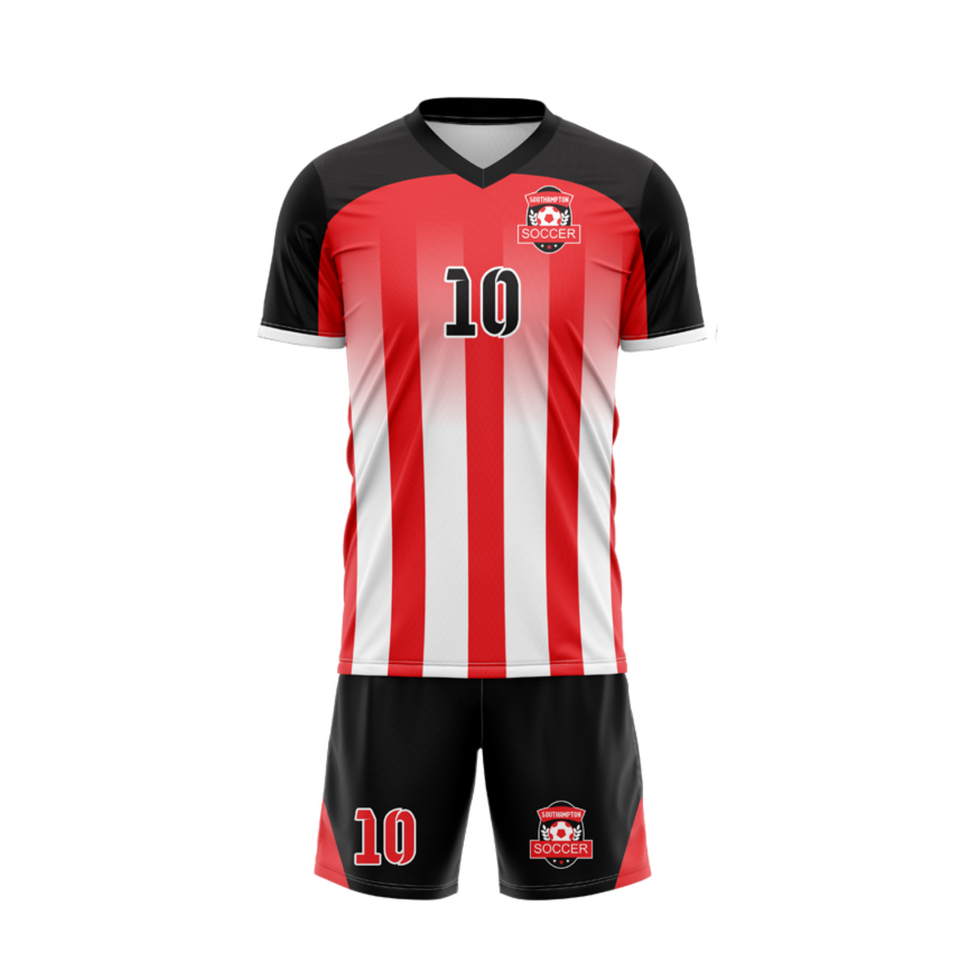 Uniforme de Fútbol Sublimado con Cuello en V, Diseño Personalizado OEM, Hecho con Tela de Poliéster Transpirable de Secado Rápido sin Costuras, Incluye Calcetines y Bolsa