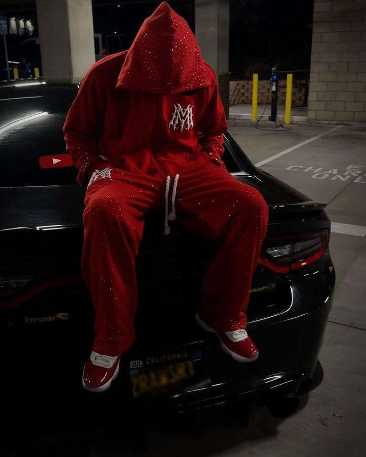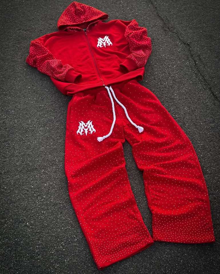 Pantalones de chándal acampanados con diamantes de imitación coloridos con cremallera desgastada personalizada OEM y conjuntos de sudadera para hombre, ropa de calle, chándal lavado con ácido