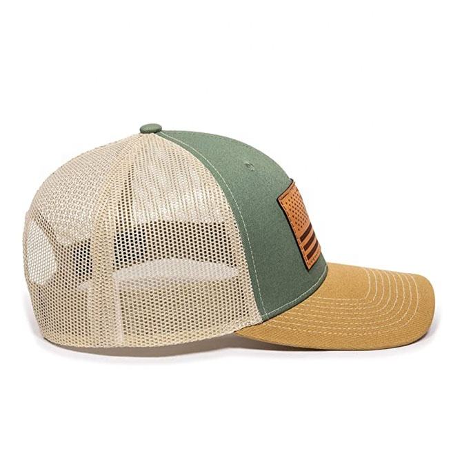 Gorra trucker OEM personalizada de alta calidad de 6 paneles, perfil bajo, algodón, visera precurvada y malla, con parche de cuero