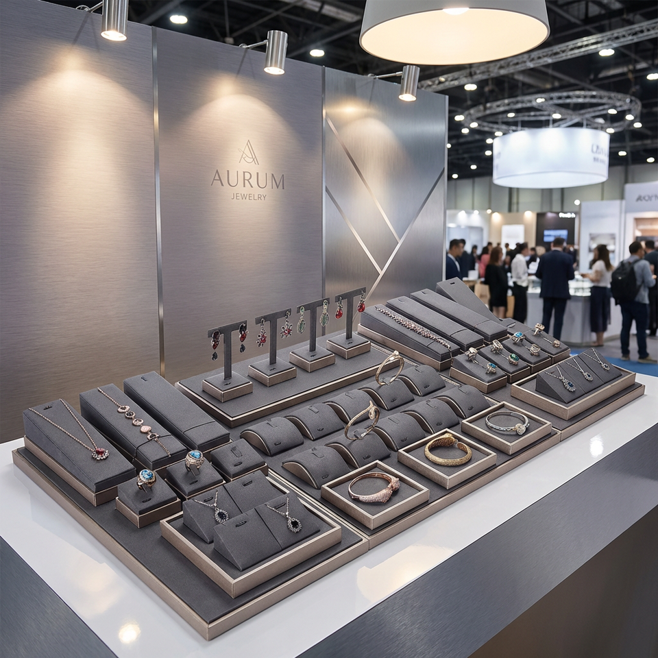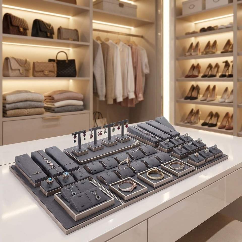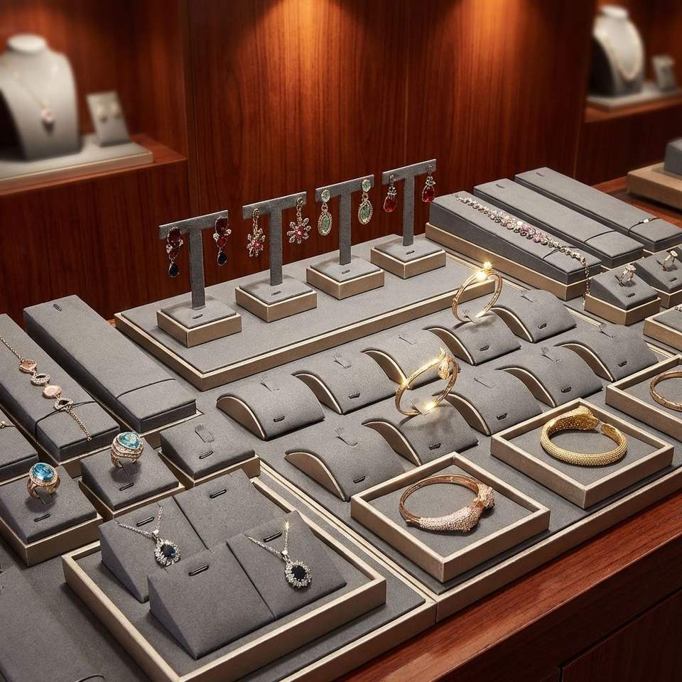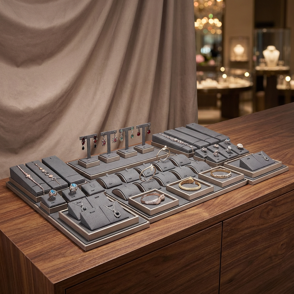 Soportes de exhibición de joyería personalizados OEM de cuero PU de color y madera para anillos, pulseras y cadenas, para tiendas