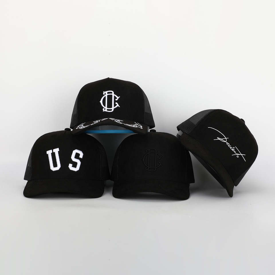 Gorra de camionero de malla con logotipo bordado de béisbol con visera curva de ante negro para hombre de 5 paneles, gran oferta personalizada OEM