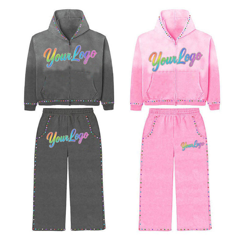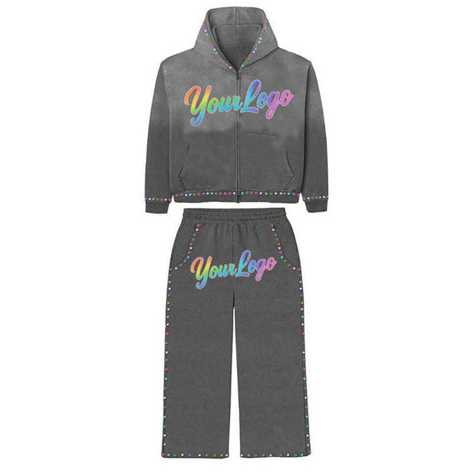 Conjunto de Sudadera con Capucha y Pantalones de Algodón Tejido con Pedrería Brillante y Transpirable, con Logotipo Personalizado OEM, para Hombre, Color Gris Rosa, Estilo Hip Hop, Invierno