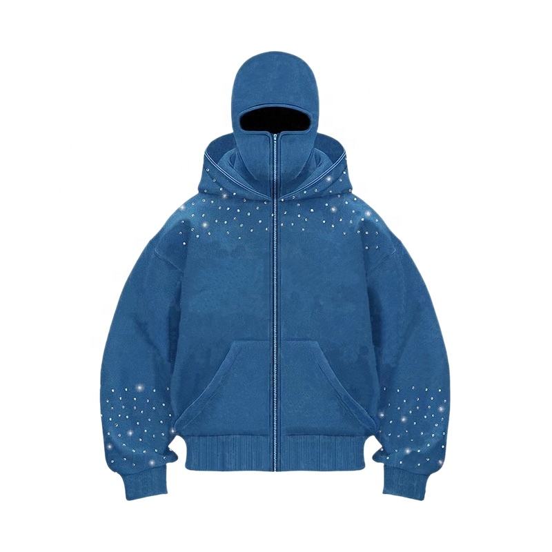 OEM logotipo personalizado de los hombres máscara de la cara con cremallera completa pasamontañas sudaderas con capucha de esquí enmascarado de lana de algodón Ninja Rhinestone Heavy Streetwear sudaderas con capucha